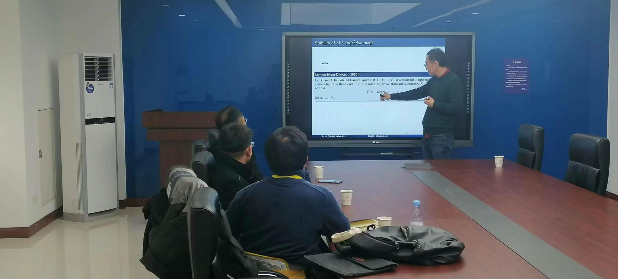 程庆进教授的报告以严谨的语言介绍了自己的成果,从一致嵌入的概念出发,以超自反球均匀嵌入问题、超自反扩张问题和Kasparov-Yu问题为切入点,最终证明了c0空间的一些子集一致嵌入到Hilbert空间中。李磊教授的报告以直观的数据语言展示了自己的成果,带来了震撼的视觉体验,从“good” ordered Banach spaces概念出发,对非满映射考虑其δ满,最终得到正锥上等距算子的稳定性。李晋副教授的报告主题是仿射函数值的赋值,赋值域从最开始的数到凸体,在介绍过程中,李晋教授多次画图,使得参会老师更加直观的了解到凸几何中的相关概念。各位教授的报告为参会者提供了非常精彩的学术视听盛宴。