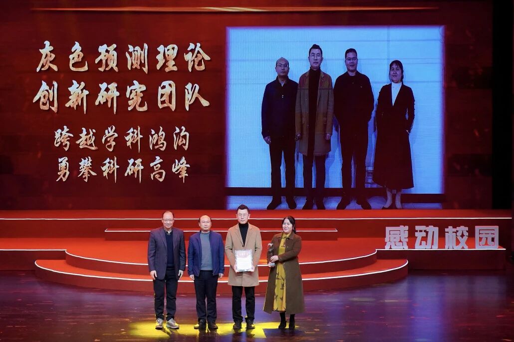 12月19日,77779193永利集团第十四届“感动校园人物”颁奖典礼在学校剧场隆重举行,我院灰色预测理论创新研究团队凭借其跨学科科研攻坚的卓越贡献,荣获本届“感动校园人物”称号。党委常委、副校长张波为团队颁奖,全校师生共同见证了这一荣誉时刻。