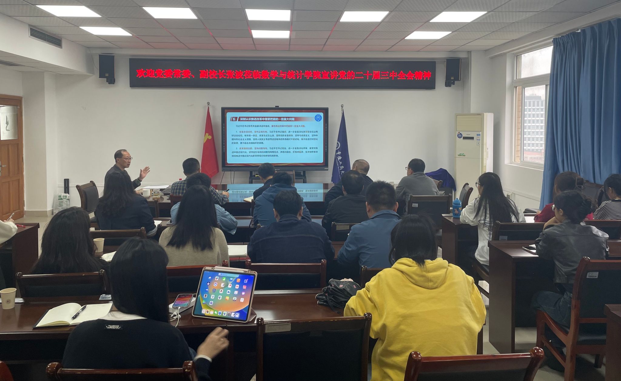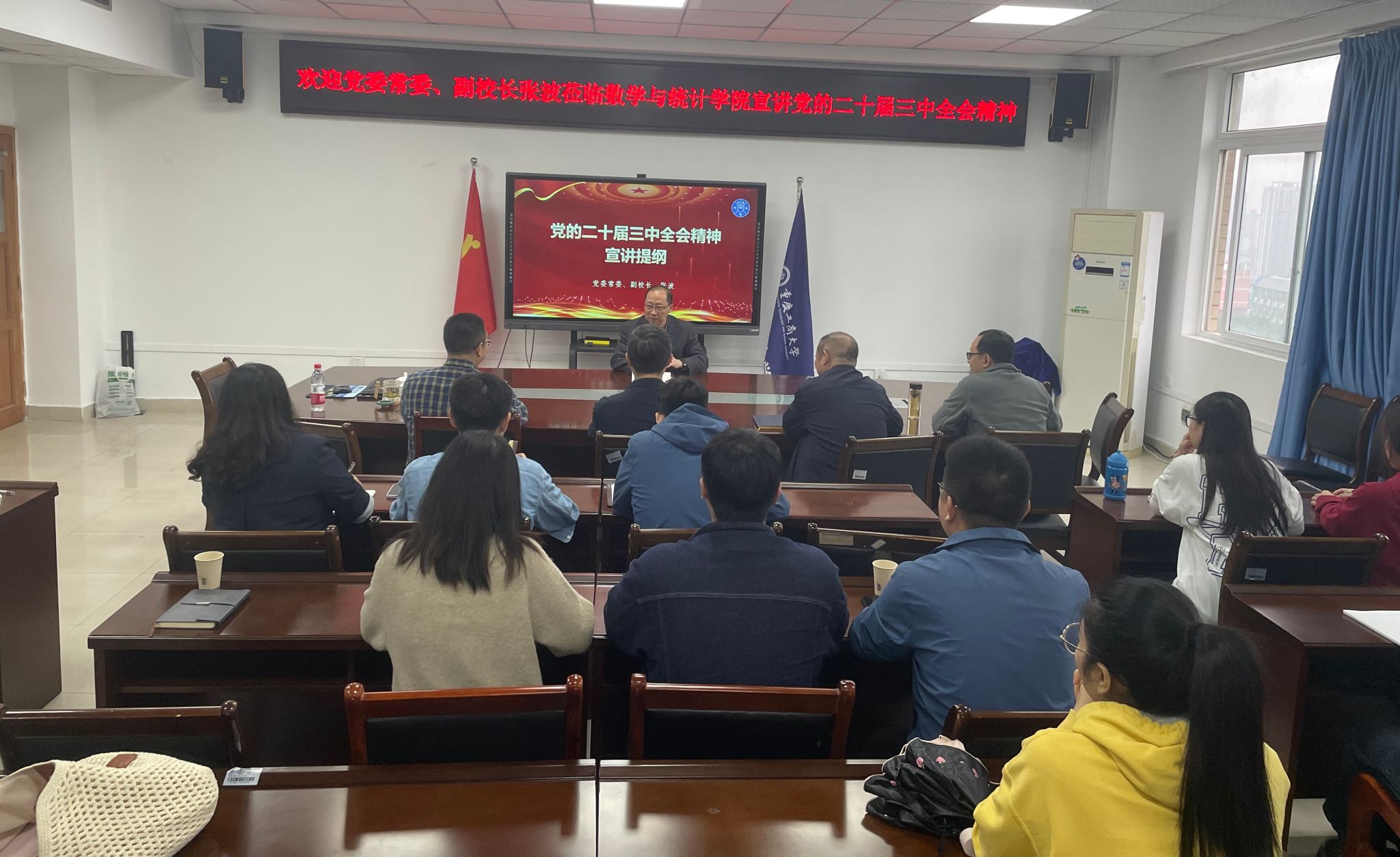 10月11日上午,学校党委常委、副校长张波莅临数学与统计学院宣讲党的二十届三中全会精神,学院领导班子、专职组织员、支部书记、支部委员、骨干教师、坐班人员等共计30余人到场听讲。宣讲会由学院党委书记张朝毅主持。