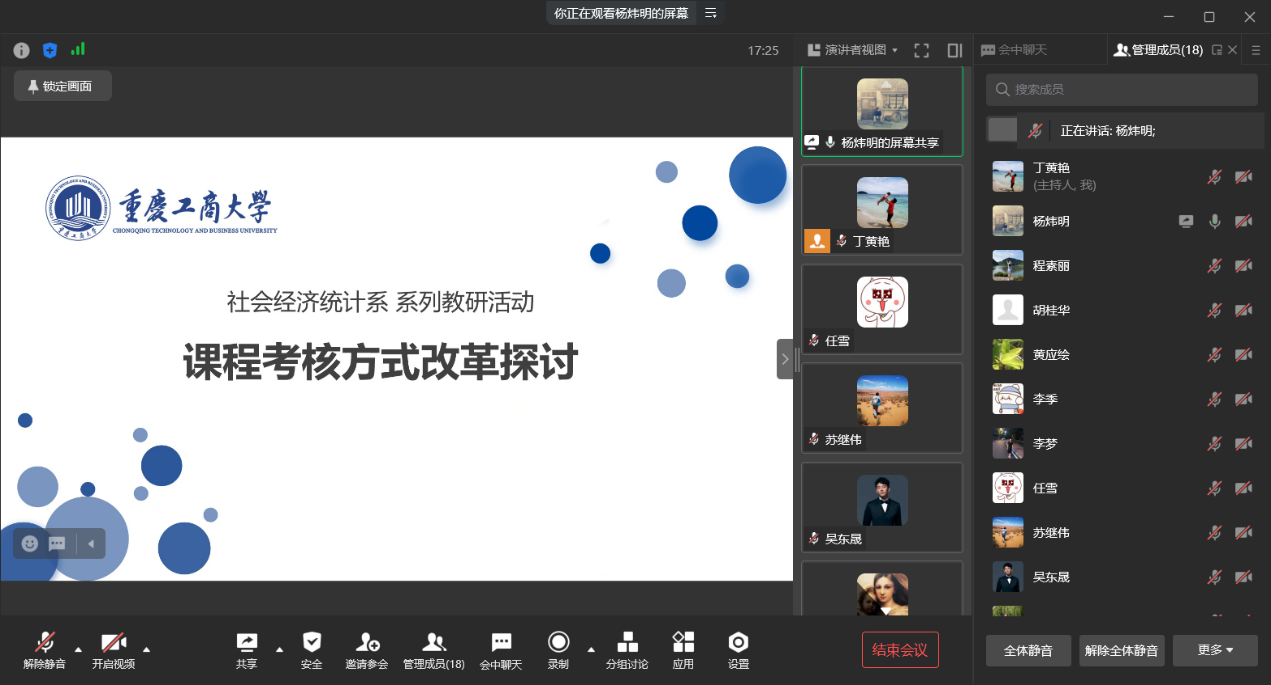 2022年11月29日中午,数学与统计学院社会经济统计系全体老师开展教研活动,对课程考核方式改革开展了研讨,本次教研活动由系部主任杨炜明主持。