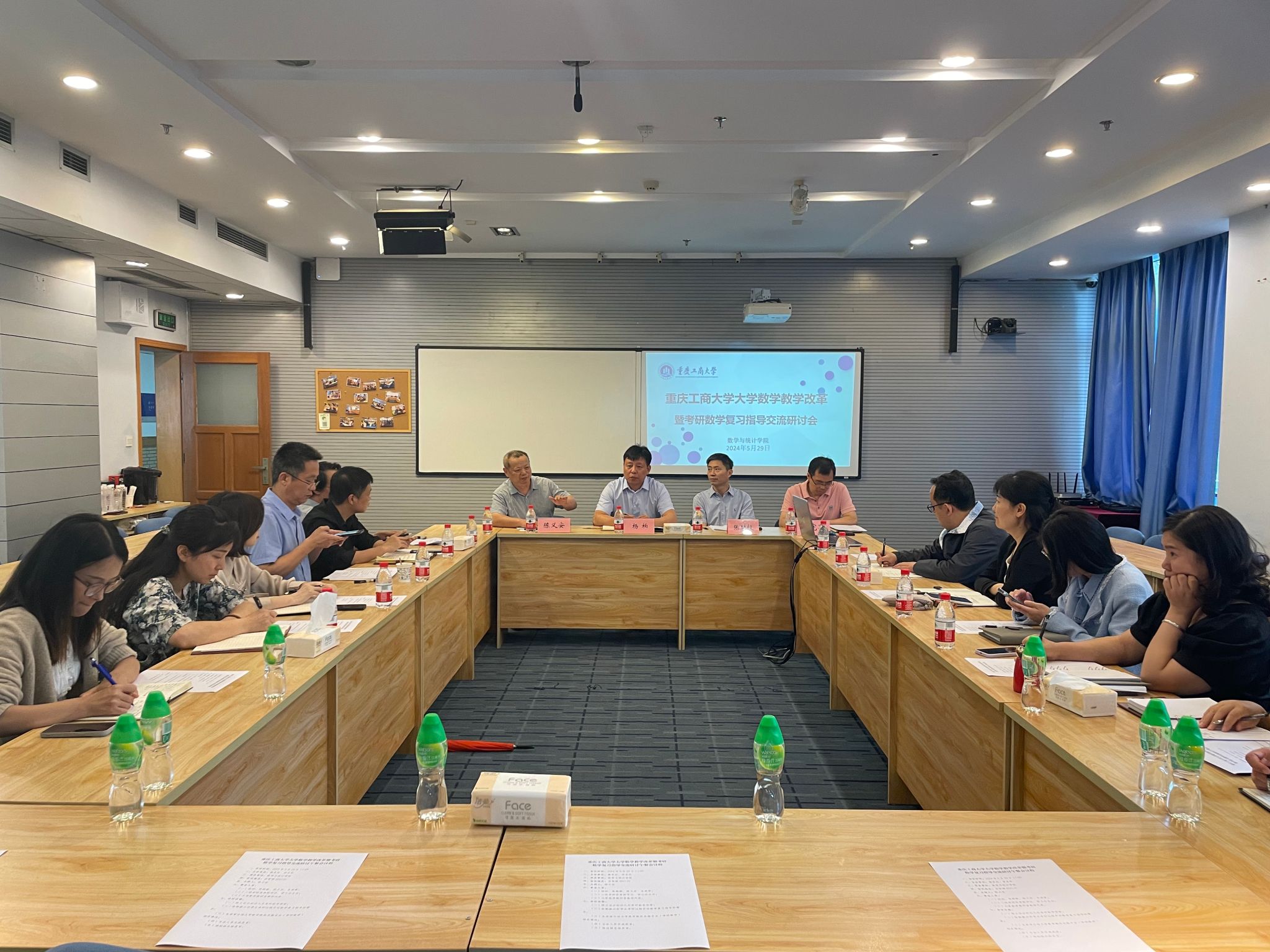 为深化大学数学教学改革,提升考研数学辅导的质效,5月29日,由教务处和学生处主办、数学与统计学院承办的交流研讨会在启智楼80412C会议室举行,教务处处长杨柏、学生处副处长张朝毅、数学与统计学院党委书记潘焱、院长陈义安、副书记吉杲、副院长龙宪军及部分学院副书记参加了会议。