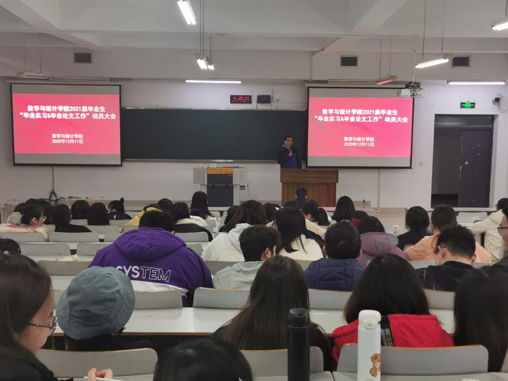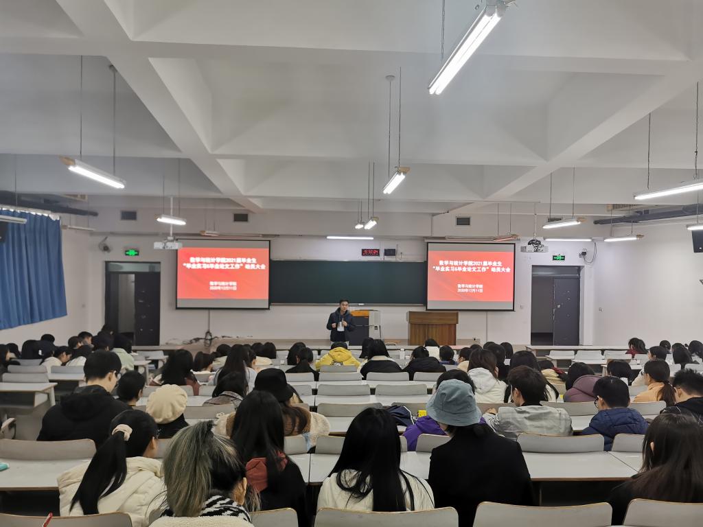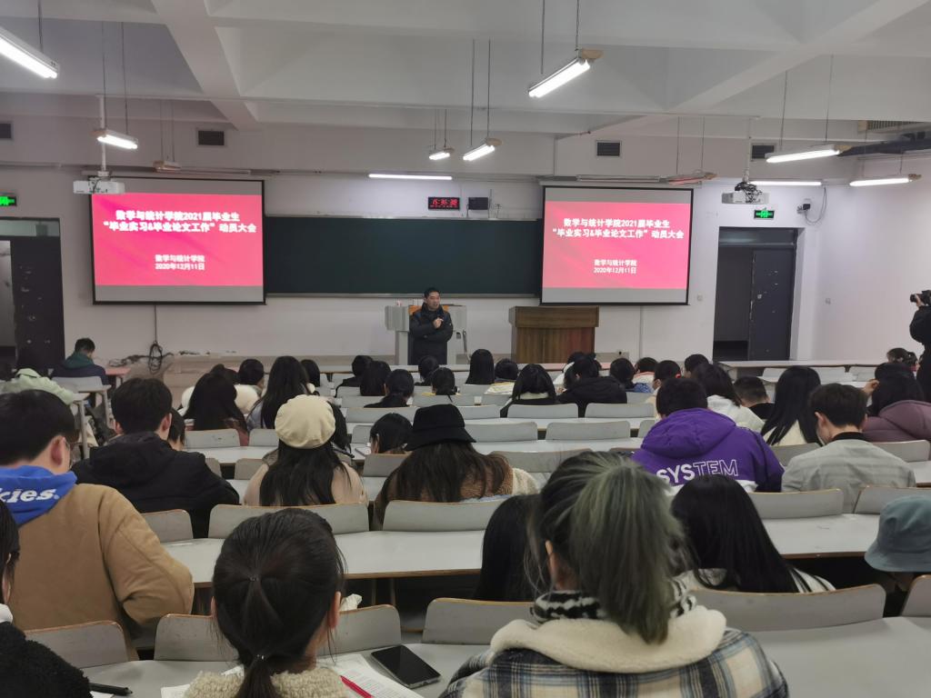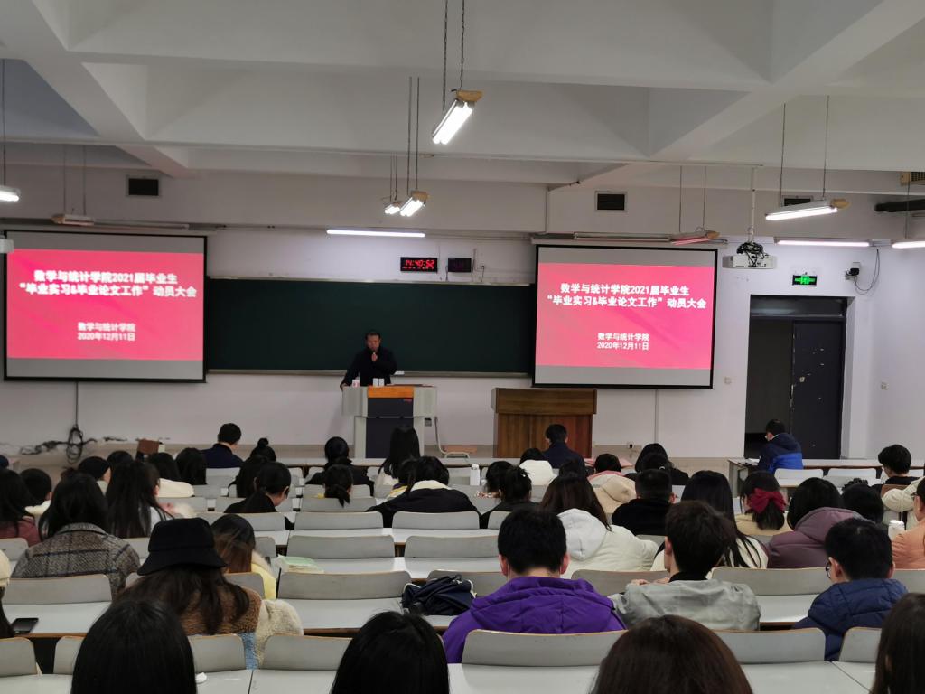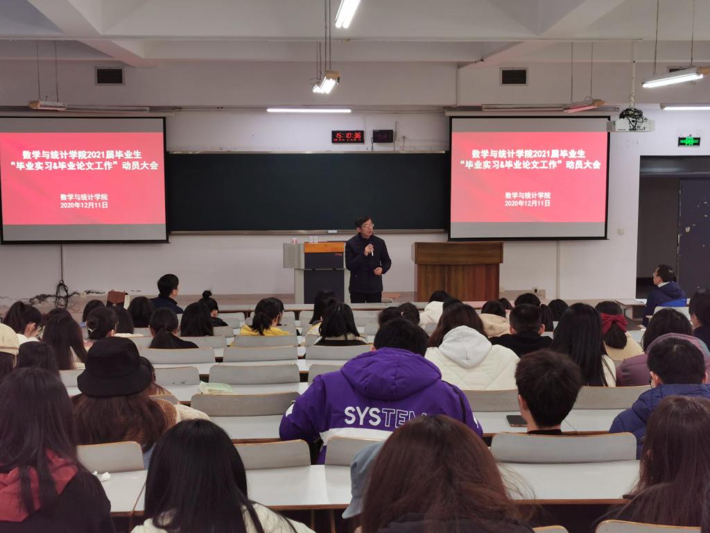 为了启动和规范2021届毕业生的毕业实习和毕业论文工作,数学与统计学院近日在博智楼7322教室召开了“毕业实习和毕业论文工作”动员大会。学院院长陈义安、副书记张朝毅、副院长叶勇、龙宪军、系主任陈修素、杨炜明以及学院相关科室负责人出席了会议。2021届全体学生参加了此次会议。