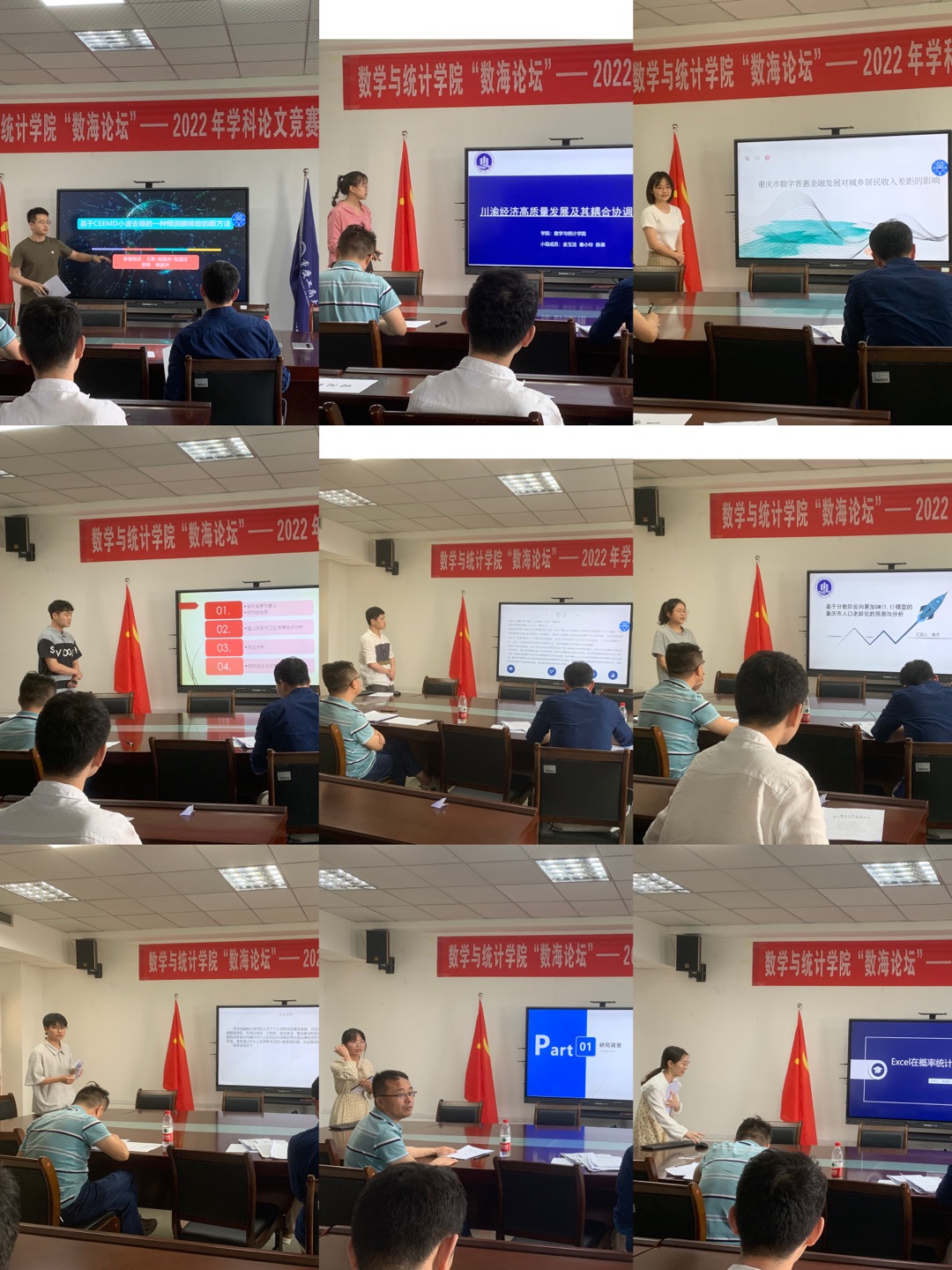 答辩赛分数学学科组和统计学科组,各参赛队伍将自己的参赛论文依次进行PPT展示和答辩。评委老师就选题的新颖程度、方法的灵活应用、模型构建的创新点等各个方面进行了精彩的点评。最后,《基于相关性分组的Vine-Copula模型的股票市场风险度量》(刘明成)、《基于 CEEMD 小波去噪的一种预测碳排放的新方法》(王斯、杨澈洲、张国浩)获得统计学科组一等奖,《A new variance-based subgradient extragradient algorithm with line search for stochastic variational in equalities》(贺月红、杨静)、《求解非单调变分不等式的两类投影算法》(方珍洁、王霄婷)获得数学学科组一等奖。