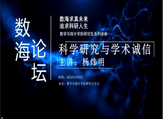2022年9月9日下午,由数学与统计学院研究生会承办、刘亚莉老师主持,面向学院全体研究生的“数海论坛”,邀请了学院杨炜明教授进行了题为《科学研究与学术诚信》的讲座。