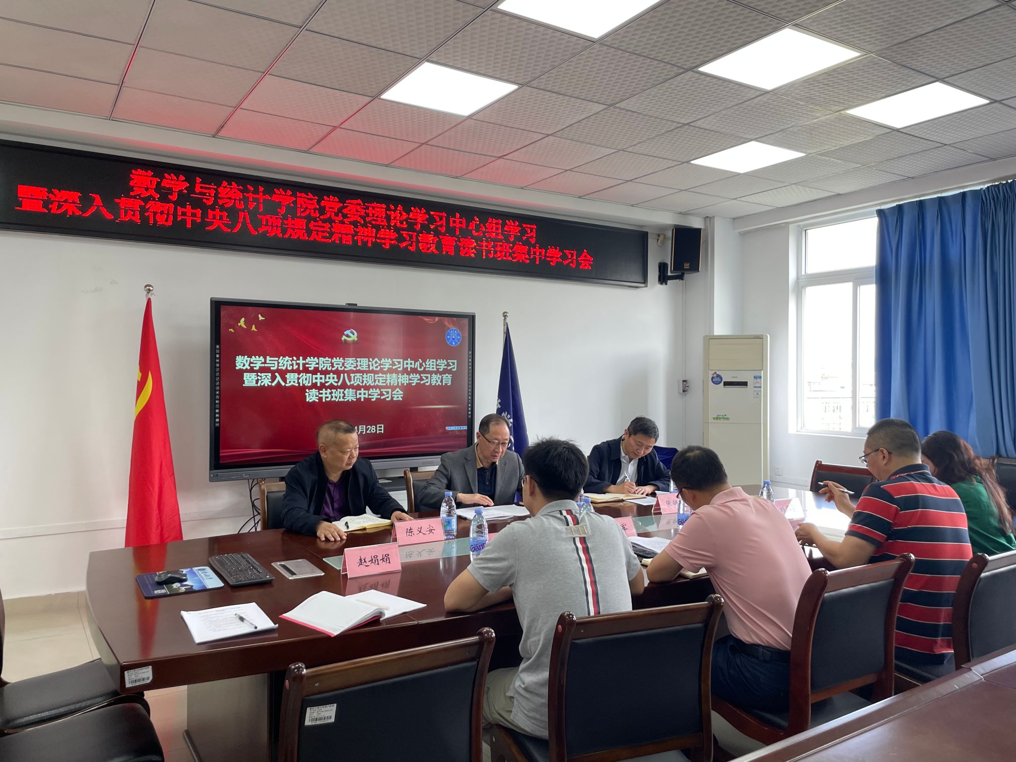 4月28日上午,数学与统计学院党委在80602会议室召开党委理论学习中心组学习暨深入贯彻中央八项规定精神学习教育读书班集中学习会。学校党委常委、副校长张波到场指导,学院党委委员及读书班成员参加了学习会。