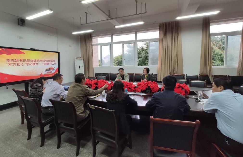 2019年10月14日,校党委书记李志雄、组织部部长郑夕春莅临数学与统计学院指导“不忘初心、牢记使命”主题教育工作。学院领导班子参加了会议。