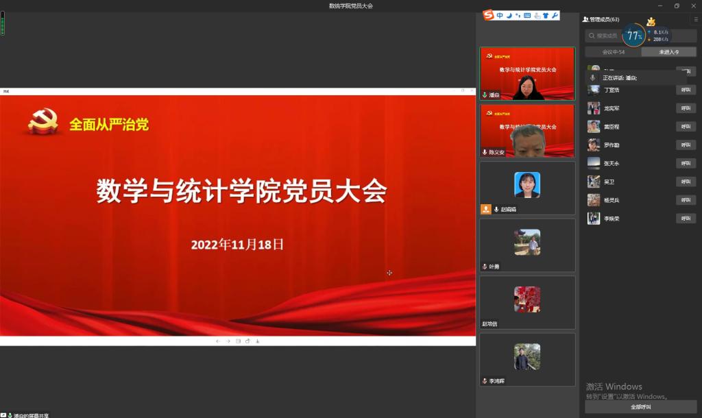 为扎实做好党的二十大精神学习宣传工作,11月18日下午16:00,数学与统计学院党委在线召开全体教师党员大会,动员部署党的二十大精神学习宣传工作,会议由学院党委书记潘焱主持,学院全体教师党员参加了会议。
