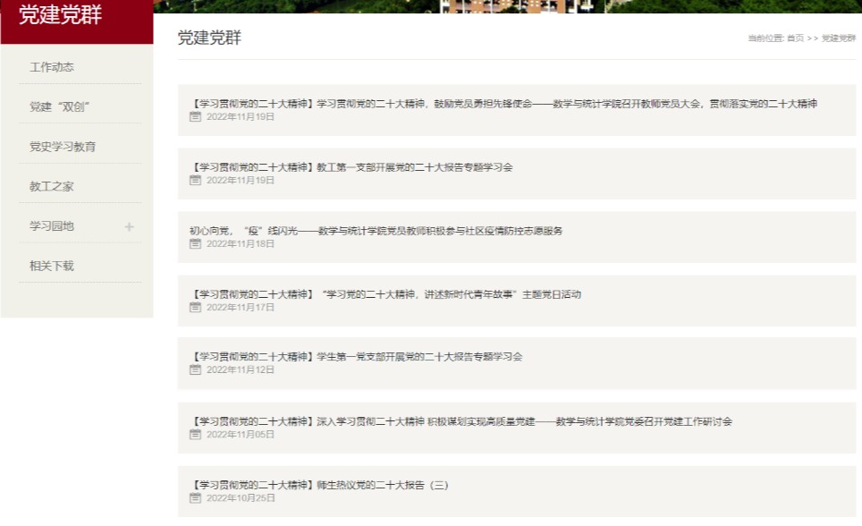 10月16日至22日,中国共产党第二十次全国代表大会在北京胜利召开。为深入学习宣传贯彻党的二十大精神、感悟思想伟力、汲取奋进力量,数学与统计学院党委通过多种形式认真开展党的二十大精神学习活动,引导师生切实把思想、认识和行动统一到党的二十大精神上来。