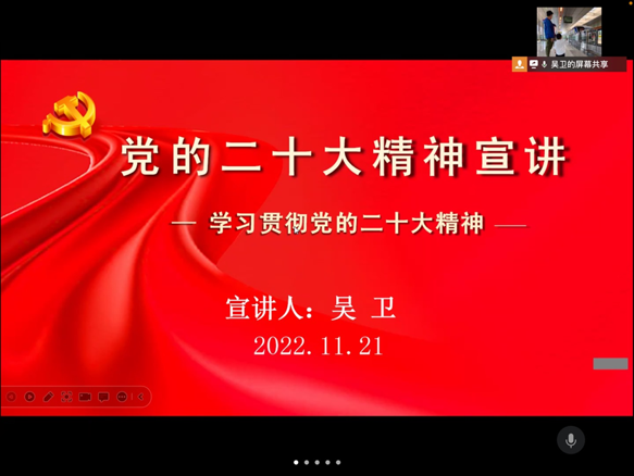 11月21日中午,数学与统计学院学生第二党支部线上开展了党的二十大报告专题宣讲活动,本次会议由支部书记吴卫主持,支部全体党员参加。
