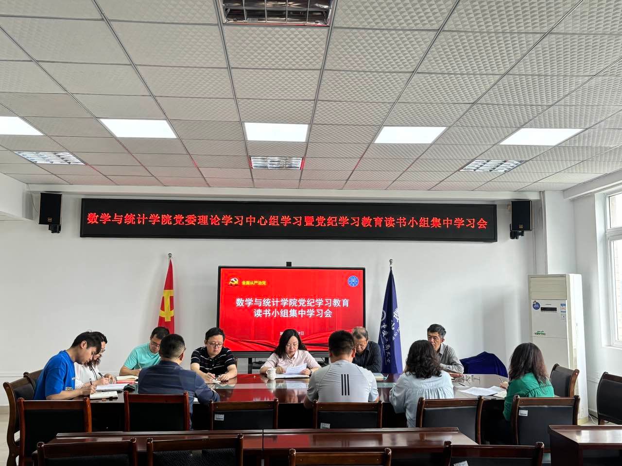 5月7日上午,数学与统计学院在80602会议室召开5月党委理论学习中心组学习暨党纪学习教育读书小组集体学习会,会议由学院党委书记潘焱主持,学院党纪学习教育读书小组成员参加会议。