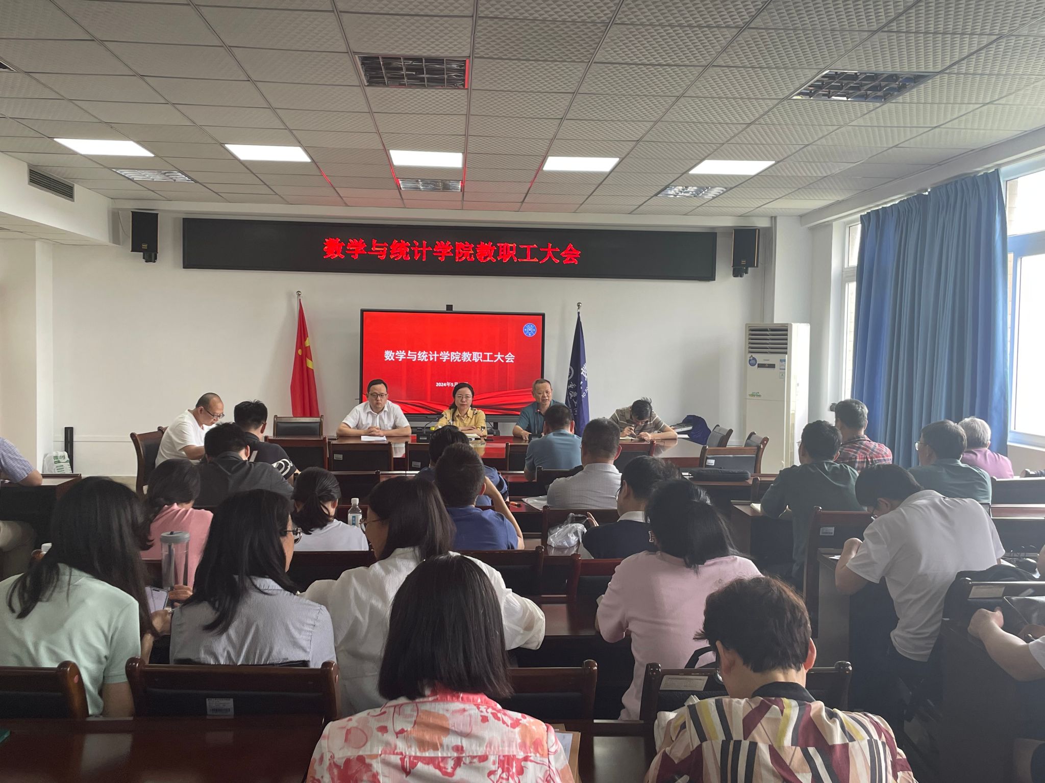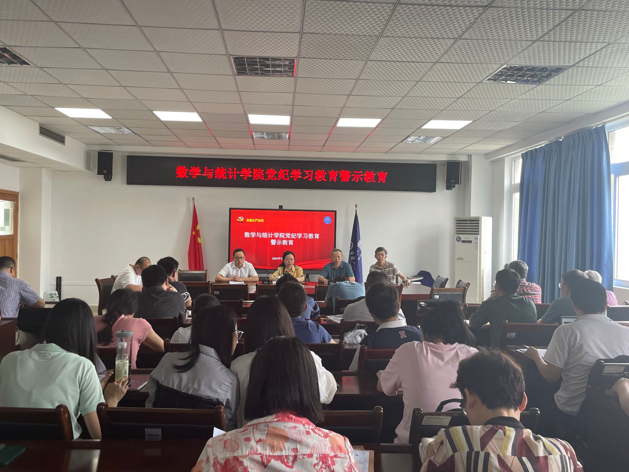 5月17日下午,数学与统计学院在启智楼80602会议室召开了全院教职工大会,重点学习习近平总书记视察重庆重要讲话重要指示精神和开展党纪学习教育警示教育,会议由学院党委书记潘焱主持。