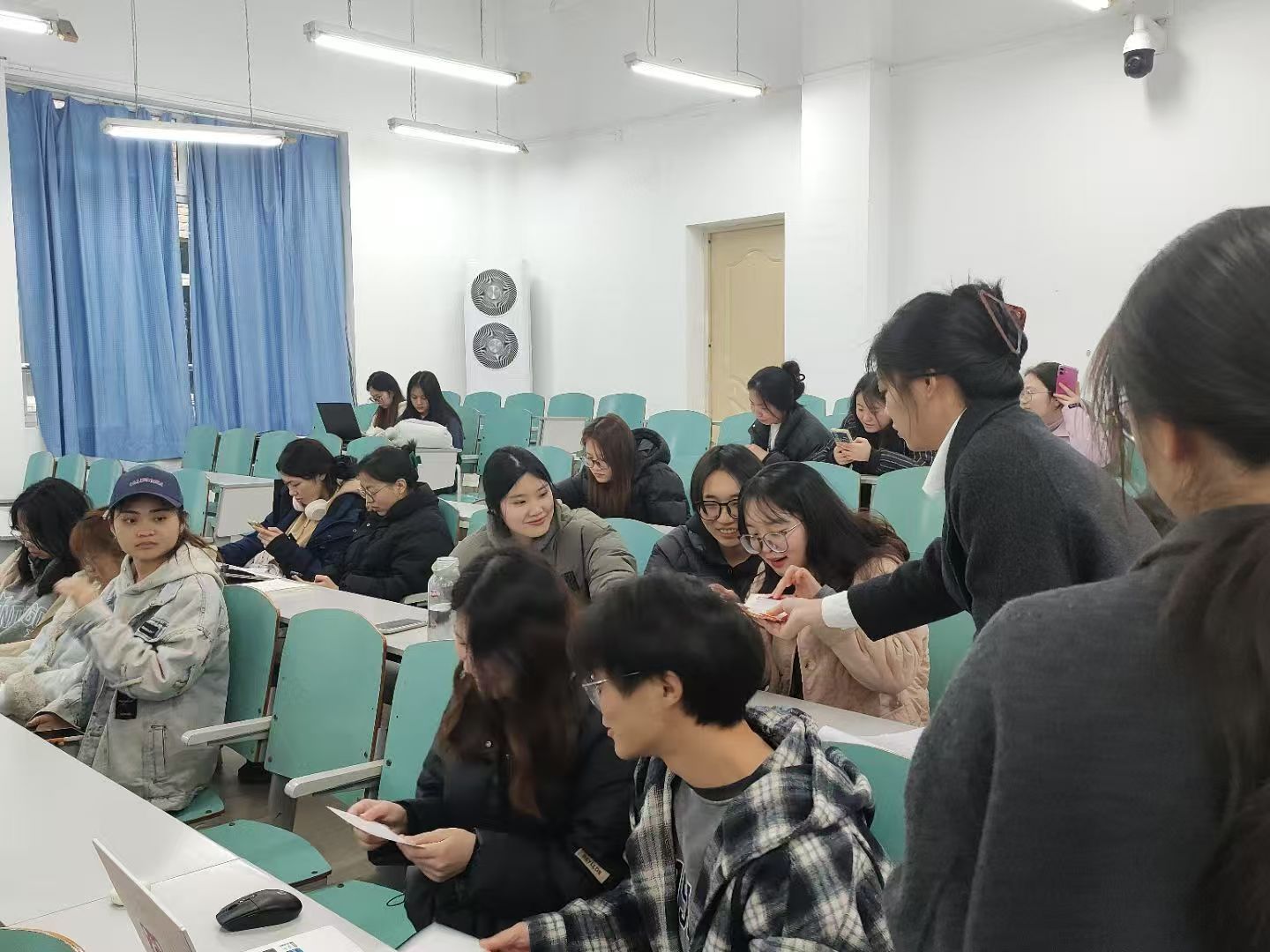 活动分为两个环节。环节一:9个小组借助PPT,讲述雷锋事迹,结合新时代背景阐释“全心全意为人民服务”精神内涵。主持人现场引导观众解析故事现实意义。环节二:观众们根据雷锋故事在明信片上写下祝福,通过随机互赠实现情感传递,推动形成“人人学雷锋”的校园氛围。