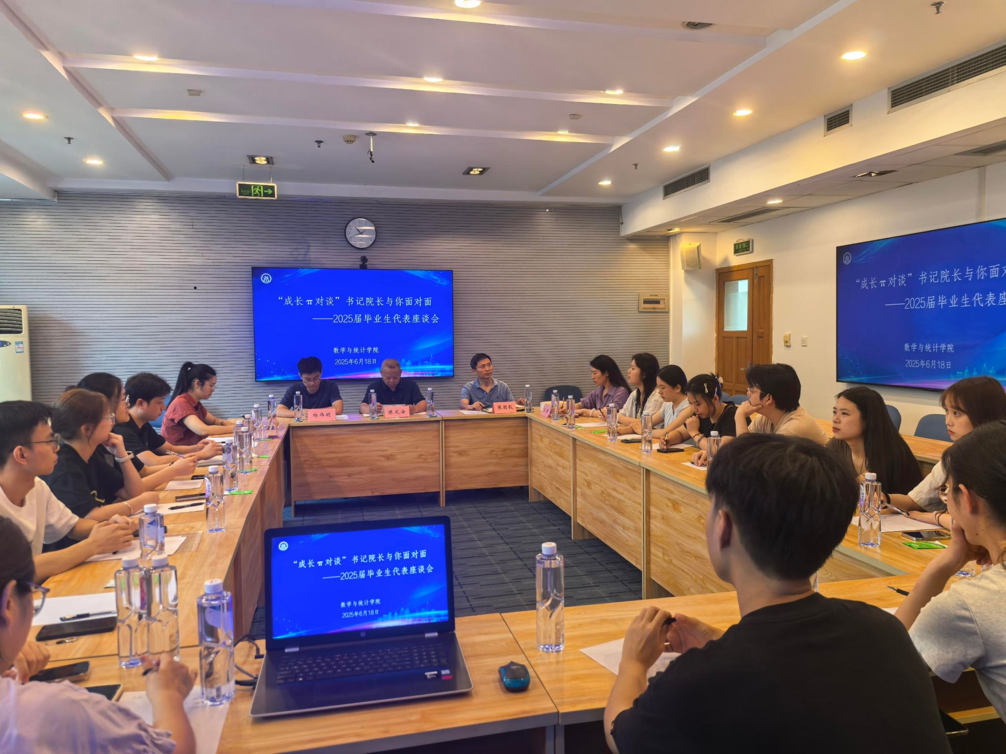 6月18日上午,数学与统计学院举行“成长Π对谈”书记院长与你面对面2025届毕业生代表座谈会。学院党委书记张朝毅、院长陈义安、副院长杨炜明、大学数学教学部副主任唐艳、经济统计系副主任任雪、学工办主任邢月军,2025届毕业生代表参与活动。座谈会由学院党委书记张朝毅主持。