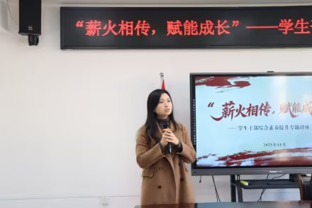 杨婷对何军的精彩分享表示衷心的感谢。她强调作为学生干部,要立志成为一个有理想、敢担当、能吃苦、肯奋斗的新青年,立足本职岗位、学会尊重他人、锤炼过硬本领,以更饱满的热情、更务实的作风投入到学生工作中,为学校发展与学生成长贡献青春力量。