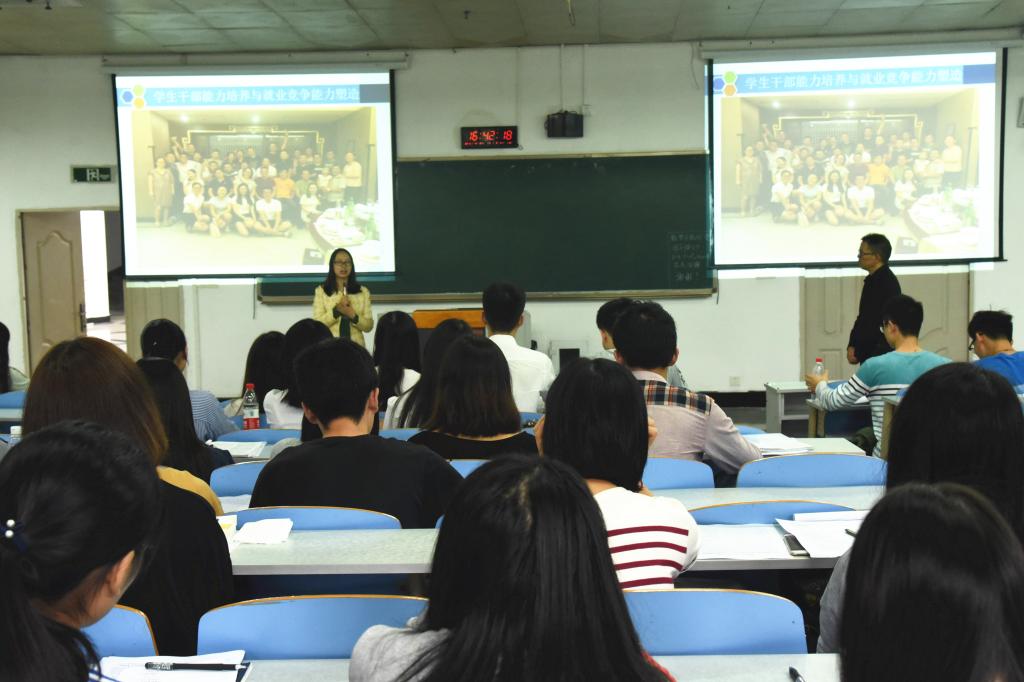 随后,我院党总支副书记易忠教授开始了培训会第二讲。易书记围绕“学生干部能力培养及就业竞争能力的塑造”这一话题展开叙述,从“大学生干部定位”、“学生干部基本素质”、“就业创新能力”等方面详细阐述了学生干部素质与能力的培养方式,并通过展示部分工商优秀毕业生在校时任团干的经历及如今事业的成就,鼓励大家努力实现自我目标,表达了其殷切期望。