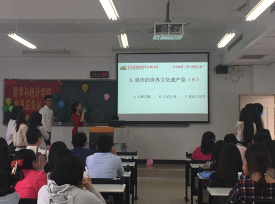 主题活动在观看“鸟瞰新重庆”的视频下拉开了序幕。程元元副书记就自己在重庆这20年来的亲身经历与同学进行了交流。接着展开紧张激烈而又妙趣横生的“知识竞答”环节,10个参赛组经过三轮比拼决出一二三名,最后由来自15统计学的胡潇组获得本次竞答比赛冠军。