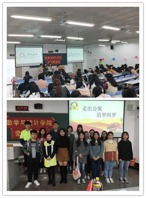 2018年10月26日,数学与统计学院党员服务站在慧智楼90208教室开展以“走出公寓,追梦圆梦”为主题的水果拼盘活动。学院党员服务站指导老师余思云和2016级、2017级入党积极分子同学参加了此次活动。