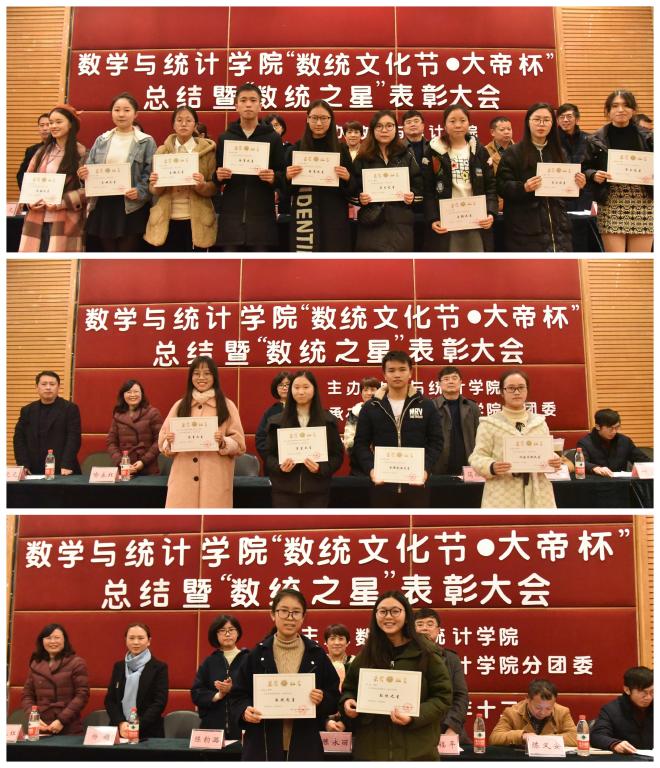 随后,叶勇副院长宣读表彰文件,与会嘉宾分三轮为“数统之星“学习之星”“竞赛之星”“自强之星”“实习之星”“体育之星”“文娱之星”“寝室之星”“创新创业之星”“社会实践之星”等获奖同学颁奖。希望全体同学以先进为榜样,以专业为载体,以自身为主力,鼓足干劲,开拓创新,勇创佳绩。随后,李霄民教授总结了我院2018年学科竞赛获得的优异成绩:我院在全国大学生数学建模大赛中获得2项全国一等奖,5项全国二等奖,美国大学生数学建模大赛中获得4项一等奖,4项二等奖的好成绩,李教授鼓励更多17级、18级的同学参与到明年的学科竞赛中去。紧接着,学生代表施丹红同学从学院学科竞赛、社会实践、暑期三下乡等活动出发,与大家交流了对于数统文化节的所思所感,分享自己的学习经验。接着,同学们为大家献上精彩的文娱节目:“游手好弦吉他社”表演了吉他弹唱,小品《向老八进京》,舞蹈《寄明月》。