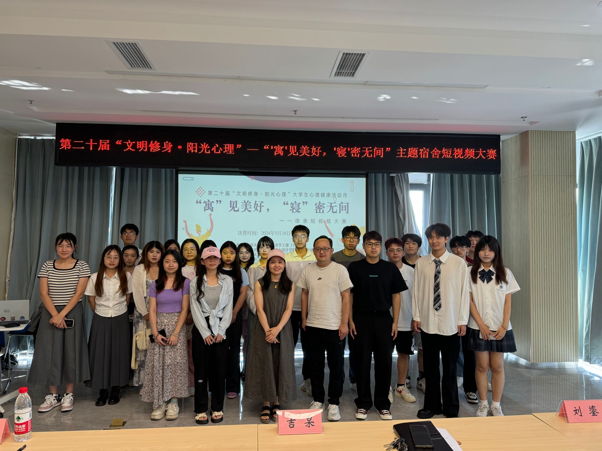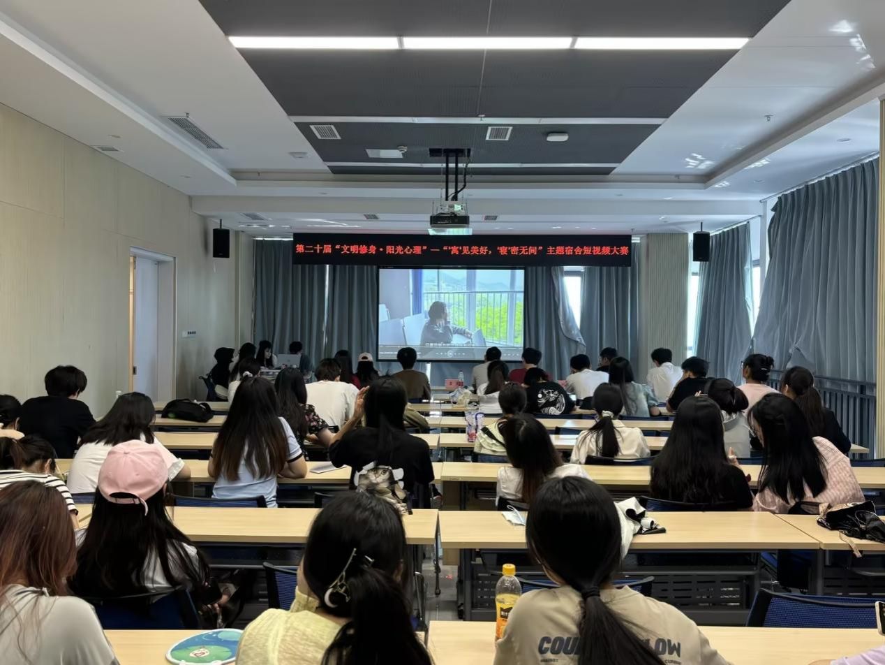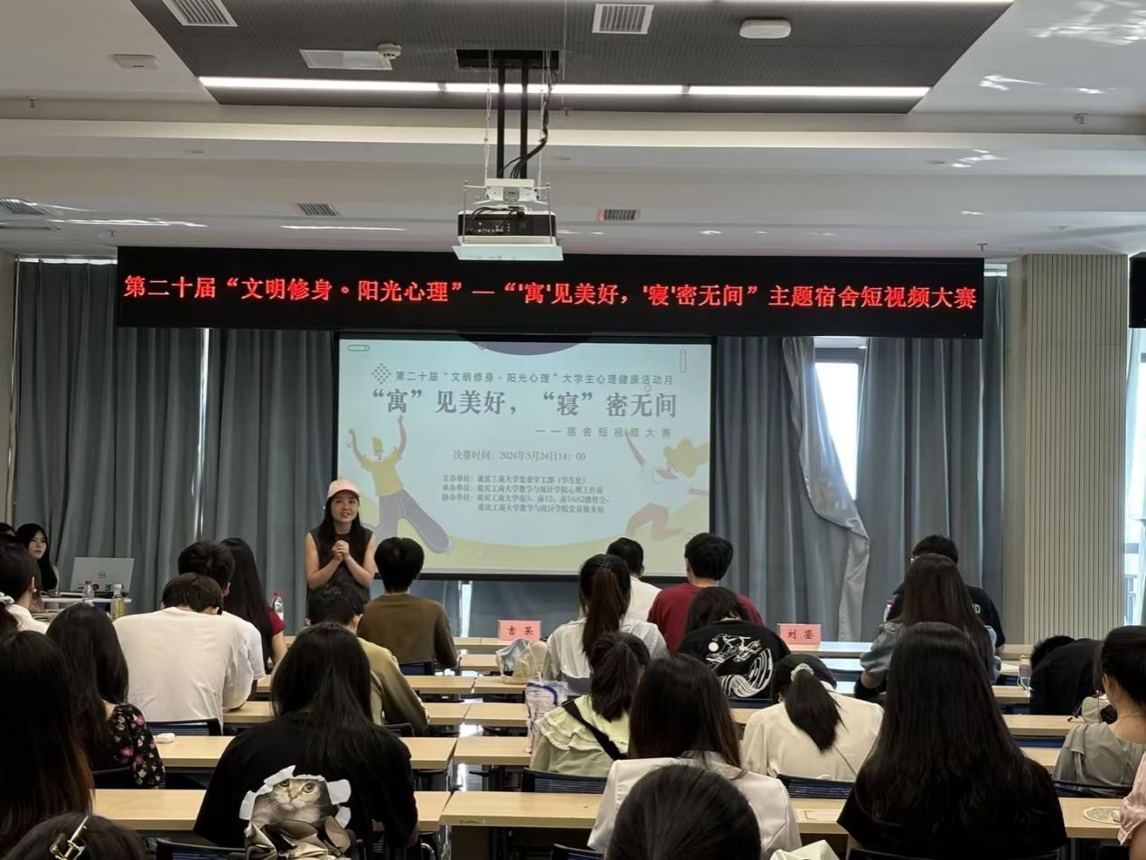 为全面贯彻党的教育方针,坚持为党育人、为国育才,落实立德树人根本任务,促进大学生心理健康,5月24日下午,由学校党委学工部学生处主办,数学与统计学院承办的第二十届“文明修身·阳光心理”大学生心理健康活动月之“‘寓’见美好,‘寝’密无间”主题宿舍短视频大赛决赛在学生事务中心302会议室顺利举行。数学与统计学院党委副书记吉杲、心理健康咨询中心黄琳、数学与统计学院专职辅导员刘鎏出席本次活动并担任大赛评委,80余名观众现场观看。