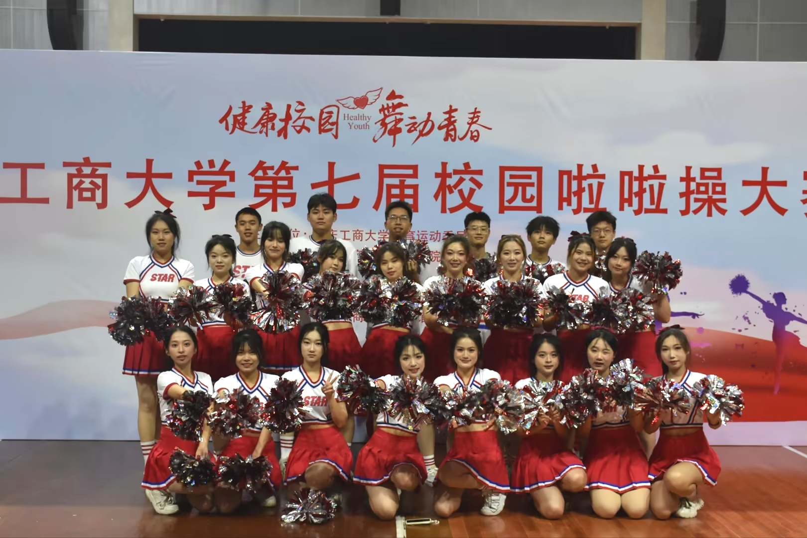 本次比赛共分为街舞、爵士舞组和花球啦啦操两个组类,数学与统计学院代表队作为花球啦啦操组第14组参加了本次比赛。这是一支由23人组成的队伍,在长达两个月的训练后,他们凭着心中的信念,终在运动场上撒下了青春的汗水。在比赛过程中,他们动作协调、整齐划一,用跳跃、旋转、翻滚、平衡等复杂的舞蹈动作诠释了舞者精神,他们用优美的舞姿和富有创意的集体造型结束了本次比赛,在全体队员的不懈努力下,数学与统计学院代表队荣获三等奖!给本次比赛画上了圆满的句号。