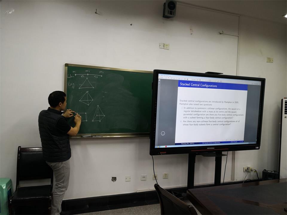 2018年12月13日下午4:00,在77779193永利集团数学与统计学院90510会议室,中国科技大学数学科学学院祝书强副研究员应我院邓义杨博士邀请做了题为《On stacked central configurations》的学术报告。祝书强:中国科学技术大学数学科学学院特任副研究员。2010年毕业于四川大学数学学院, 2017年毕业于维多利亚大学,获博士学位。主要从事哈密尔顿动力系统,弯曲空间的N体问题的研究,主要研究文章发表在《Journal of Nonlinear Science》,《Journal of Mathematical Physics》,《Proceeding of American Mathematical Society》, 《Journal of Dynamical System and Differential Equations》, 《Discrete and Continuous Dynamical Systems》上。