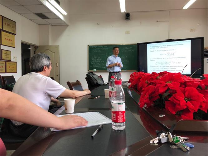 杨教授首先给出了所要研究的非欧式度量,并通过一个有趣的例子形象的给出了圆盘在欧氏度量和非欧度量下的不同,让大家对所研究的非欧度量有了一定的认识,随后杨教授又介绍了拟幂零算子的性质以及不变子空间等相关方面的研究进展。杨教授的报告形象生动,深入浅出,在座的各位老师通过杨教授的报告对非欧度量及不变子空间等问题有了深入了解,受益匪浅。