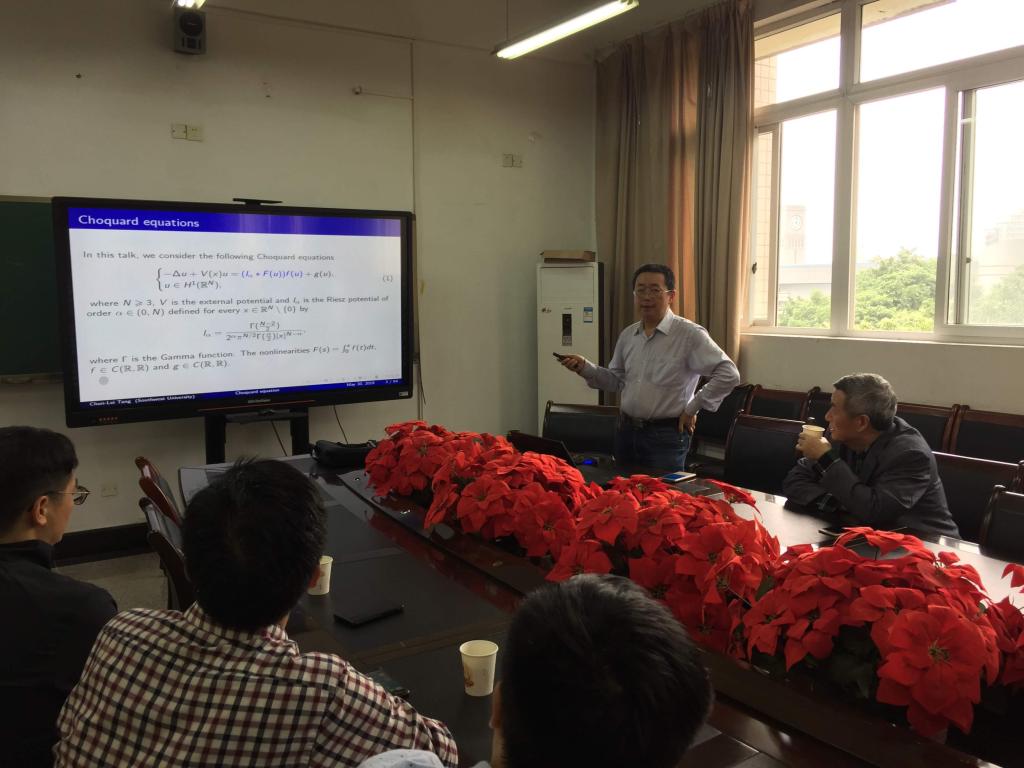 唐春雷教授首先介绍了一类新的具有深刻物理背景的椭圆方程—Choquard型方程,随后介绍了1983年Berestycki和Lions在《ARMA》上给出的获得次临界情形薛定谔方程镜像解的几乎最优条件—BL条件。接着介绍了非线性项是临界指数情形下相应的结果。一个自然的问题是这类方法能否适用于带非局部项的Choquard型方程上去。唐教授给出了肯定的答案。他分别在自治和非自治情形下获得了在BL条件下带临界指数的Choquard型方程基态解的存在性。唐春雷教授的报告深入浅出,内容丰富,对相关老师开拓新的研究领域具有重要意义。讲座结束后,唐教授同在场的老师进行了交流。