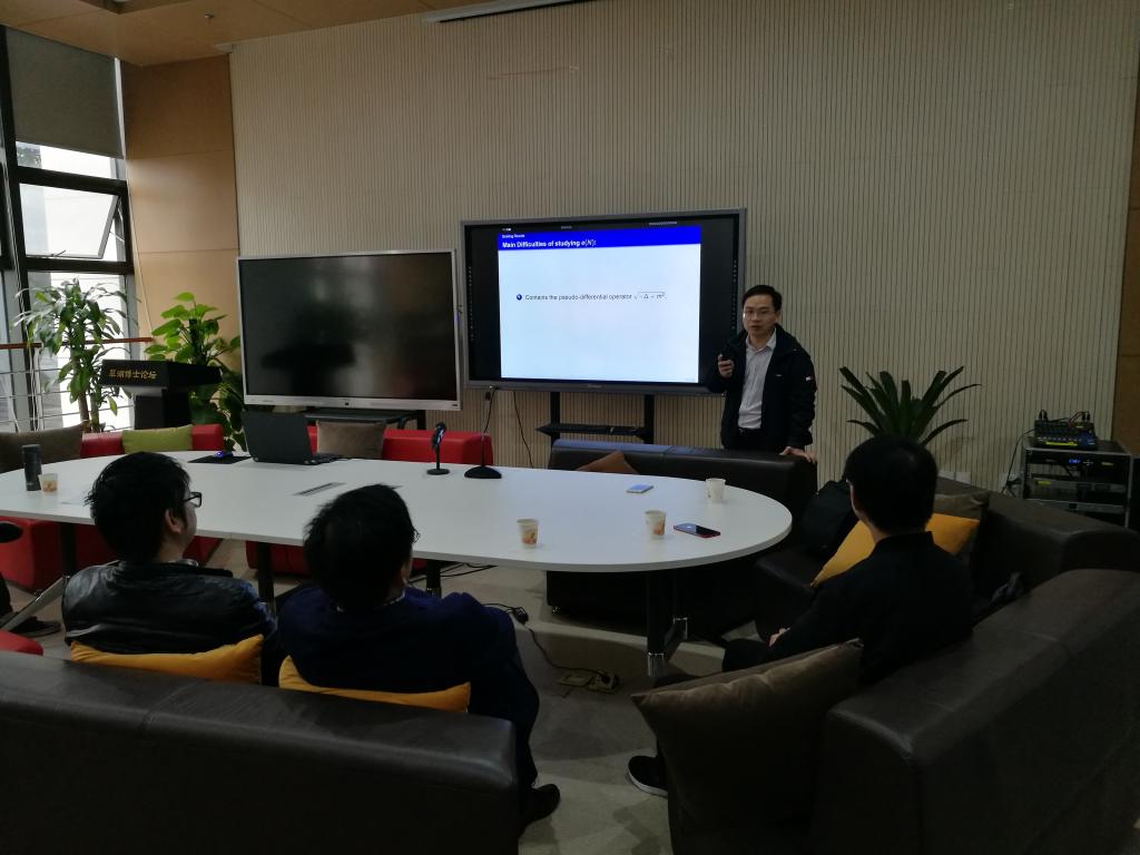 郭玉劲教授首先介绍了一类新的具有深刻物理背景的椭圆方程—Pseudo-relativistic Boson Stars型方程。随后介绍了1984年Lieb在《CMP》上给出的一个公开问题—带Hartree项的分数阶方程极小能量解的唯一性问题。郭教授详细的讲解了这类问题他们的思路,在不同的位势K(x)的影响下,获得绩效能量解的存在性和唯一性问题。