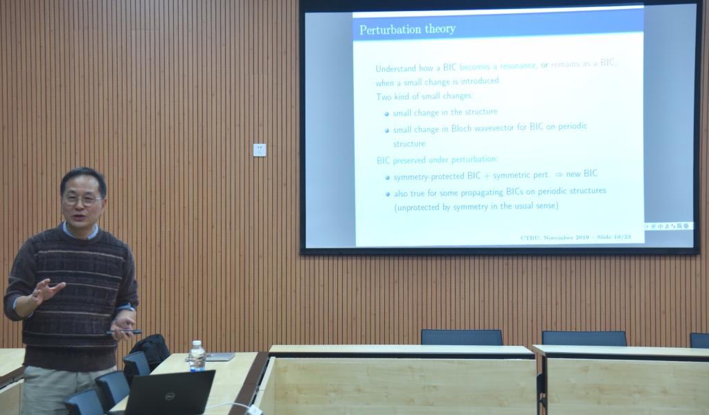 报告围绕微纳光子结构的新物理效应以及数学理论与数值计算展开。陆雅言教授从线性代数的角度分析了共振现象,同时指出一些物理模型可以被简化为简单的线性代数问题。紧接着,韩德专教授介绍了拓扑效应和类量子效应方面的进展,一是一维系统中的SSH模型和二维系统中的“谷偏振”界面态,二是平板光子晶体和表面等离激元体系中的连续谱中的束缚态(BIC)。