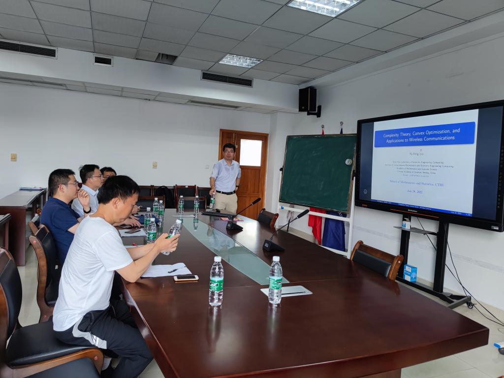 2021年7月24日上午,中国科学院数学与系统科学研究院刘亚锋副研究员莅临我院学术交流,并在80602会议室做了题为《Complexity Theory, Convex Optimization, and Applications to Wireless Communications》的学术报告,本次报告由数学与统计学院副院长龙宪军教授主持,学院孙祥凯教授、李高西副教授、李耿华博士等教师、重庆交通大学彭再云教授和部分研究生参加了此次学术报告会。