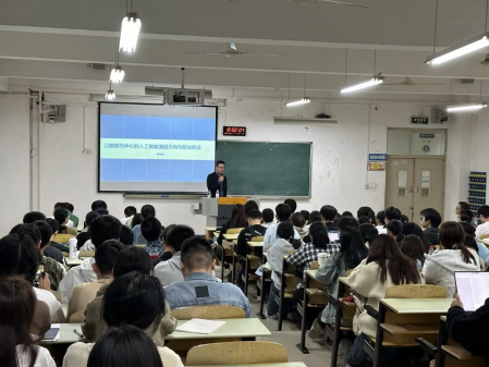 10月31日下午在江北校区B106,数学与统计学院数据科学系邀请猪八戒网数据支持中心总经理、重庆市人工智能技术创新战略联盟常务理事谭光柱先生给2023级数据科学与大数据技术专业和数据计算及应用专业约120名本科生做大数据行业发展趋势的讲座。数据科学系副主任袁利军教授参加。