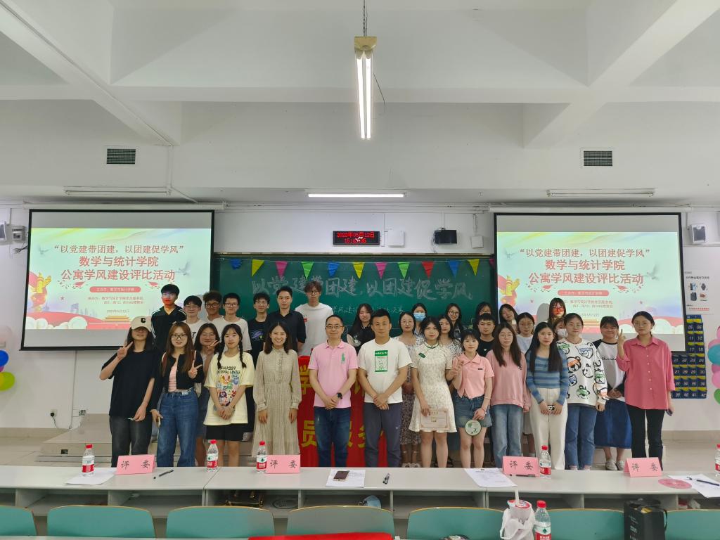 为进一步推进我校“一站式”学生社区综合管理模式建设,加强学生公寓管理,激励同学们主动改善宿舍环境,营造平安、文明、和谐、学风优良的生活氛围,树立优秀寝室典型,发挥示范引领作用,数学与统计学院党员服务站联合南3、南12、南16A2楼管会于2023年5月12日在博智楼07121教室开展了“以党建带团建,以团建促学风”公寓学风建设评比活动。全校近200名师生参与了本次活动。数学与统计学院分党委副书记吉杲、学生处公寓学工办主任冯湛、数学与统计学院学工办主任吴卫,数学与统计学院楼管会主任廖春燕、南12楼长江金昀担任活动评委。