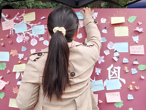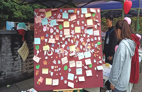 本次活动由工作人员向参与者简要介绍活动规则,并鼓励参与者在墙上写下他们想要感谢的人、事物或经历。参与者可以用便利贴书写感谢话语,也可以用手工折纸的方式表达感谢,还可以拍摄感恩墙的照片,并在社交媒体上分享,以激励更多的同学感恩并参与活动。巨大的感恩墙立在场地中央,上面贴满了同学们写下的感恩便签。便签上充满了对家人、朋友、老师、学校以及身边人的感激之情,同学们用简单的文字表达了对他人无私付出的感激。