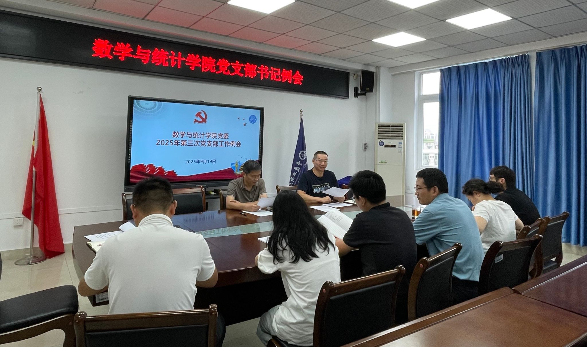 9月19日上午,数学与统计学院党委组织召开党支部书记例会,系统总结本季度党建工作检查情况,部署近期重点任务。学院党委书记张朝毅、专指组织员李华平、党务秘书赵娟娟及各党支部书记参加了会议。