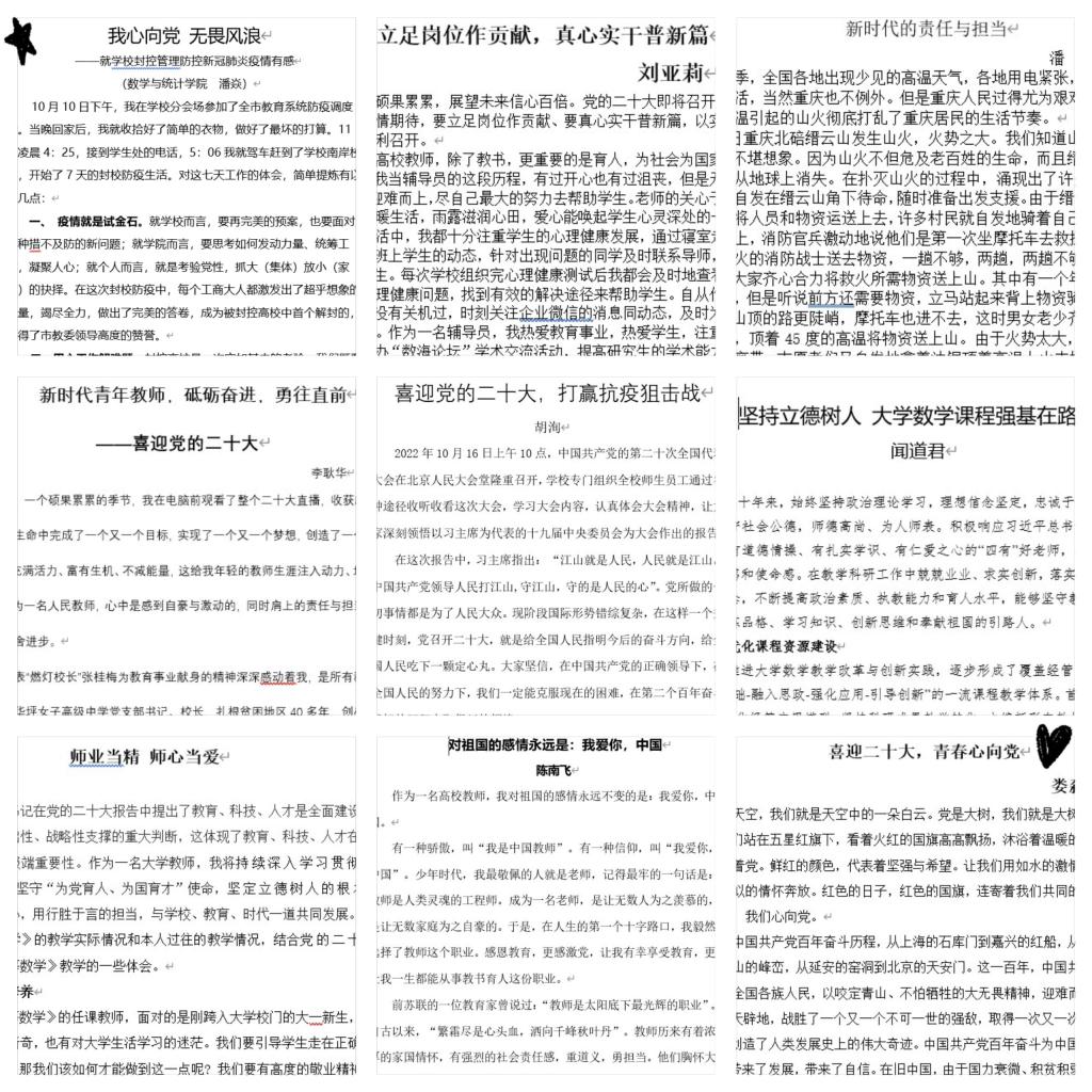 此次活动,获得了数统学院教职工积极参加。其中,有78位教职工参加了朗读比赛,他们用最走心的声音,表达对党的深爱,对祖国的热爱,对即将到来的二十大的期待;有71位教职工参加了征文活动,他们用最质朴真诚的文字,向祖国母亲和党表白,或分享教学工作经验,或抒发教师们教书育人、奋发有为的进取精神。这些朗读和征文作品充分展现了数统学院教职工们爱教育、爱生活、爱家爱党的丰富精神面貌。