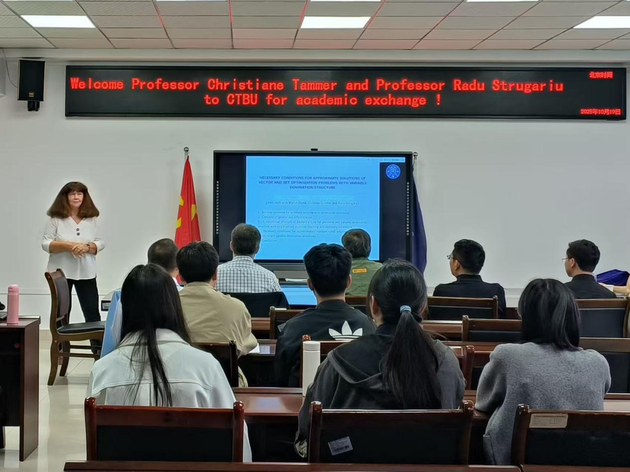 10月19日下午,应学院龙宪军教授之邀,德国马丁路德大学的Christiane Tammer教授与罗马尼亚格奥尔基阿萨卡技术大学的Raducu Strugariu教授,在数学与统计学院会议室80602为我院师生呈现了两场精彩的学术报告。孙祥凯教授、李高西教授、李耿华副教授、黄应全老师、苟准博士以及运筹学与控制论专业的研究生共同参与了此次学术交流活动。
