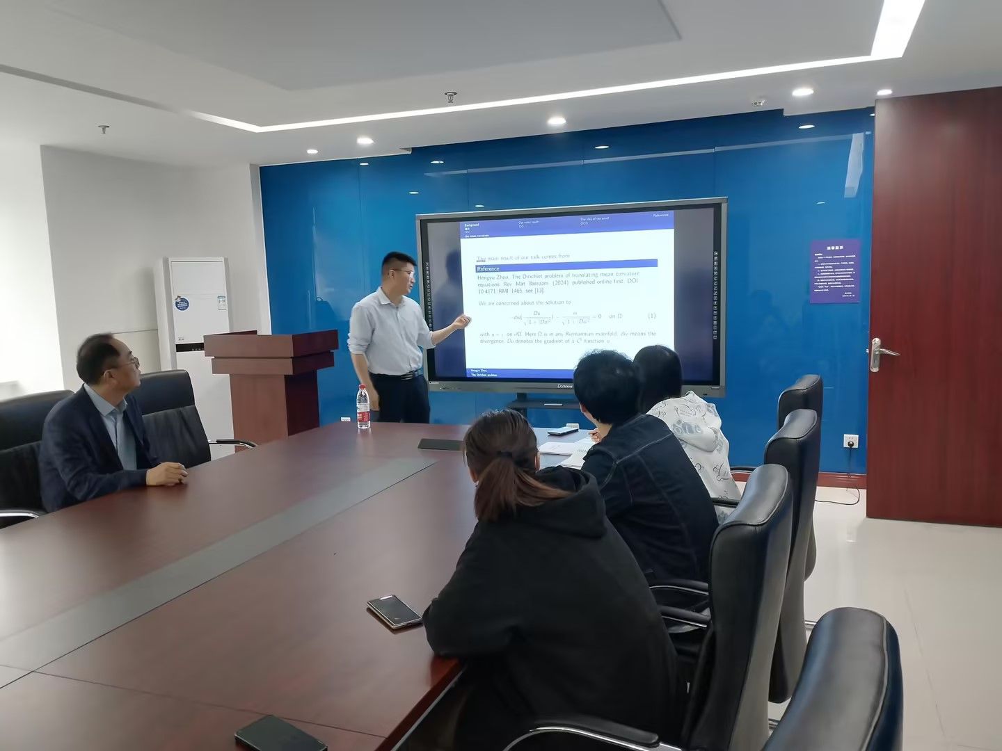 周恒宇教授讲授了平移平均曲率方程Dirichlet问题的一个结果。首先证明了如果一个域是平均凸的,并且它的闭包不包含任何闭的极小超曲面,则平移平均曲率方程的Dirichlet问题具有经典解。平移平均曲率方程的主要困难是不存在预先估计。克服这个困难主要工具是BV函数,这是Giusti的一种广义求解方法。这项工作将出现在REVISTA MATEMATICA IBEROMERICANA上。在报告结束后,师生提出有关报告的相关疑问,周恒宇教授一一解答,此次学术交流的顺利开展对我院相关领域的师生具有重要的科研意义。