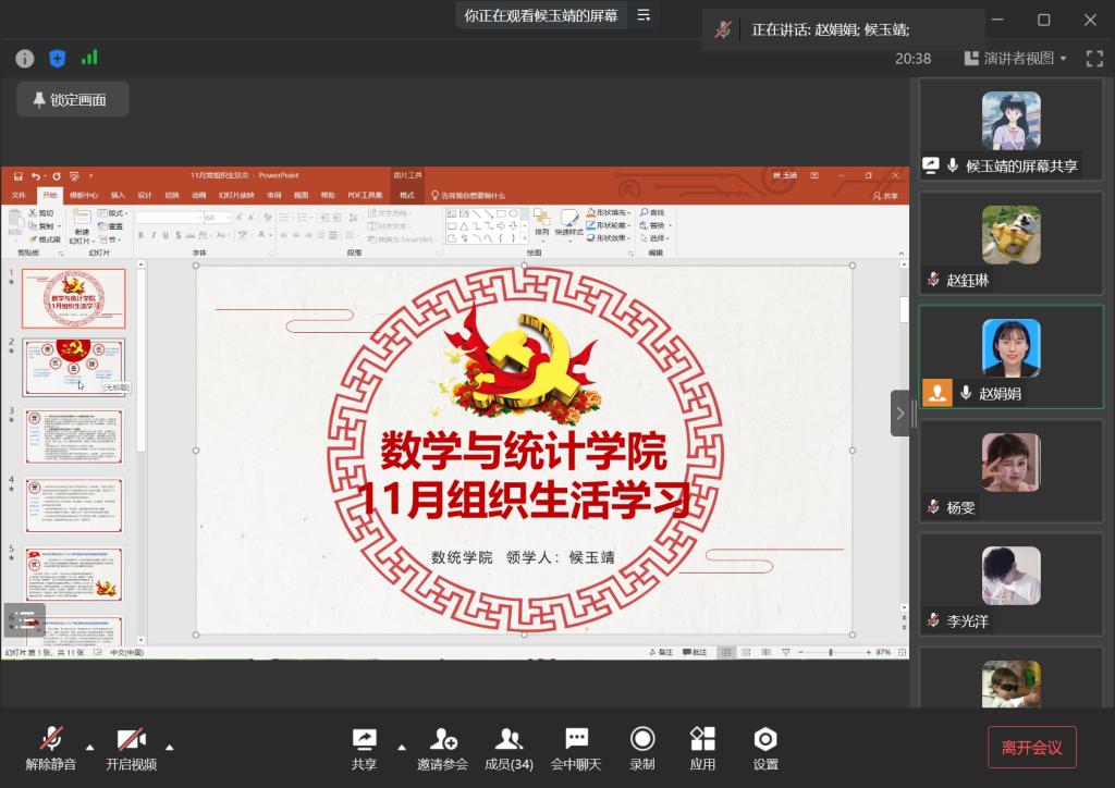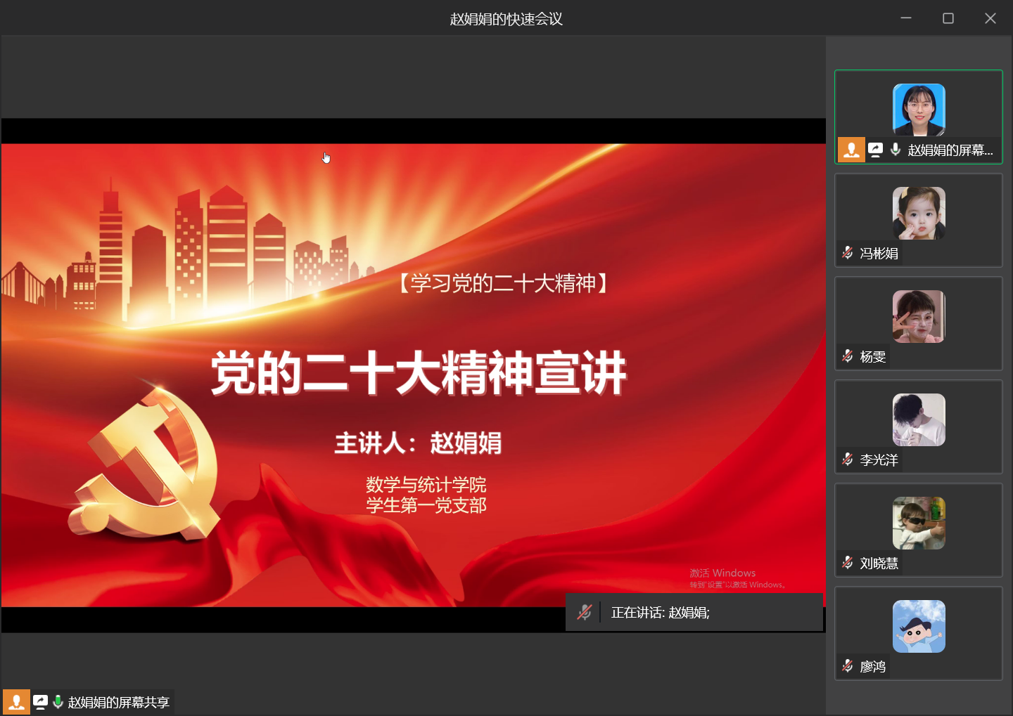 11月22日晚,数学与统计学院学生第一党支部在线开展党的二十大精神宣讲活动,活动由支部书记赵娟娟主持,37名党员参加了宣讲学习。