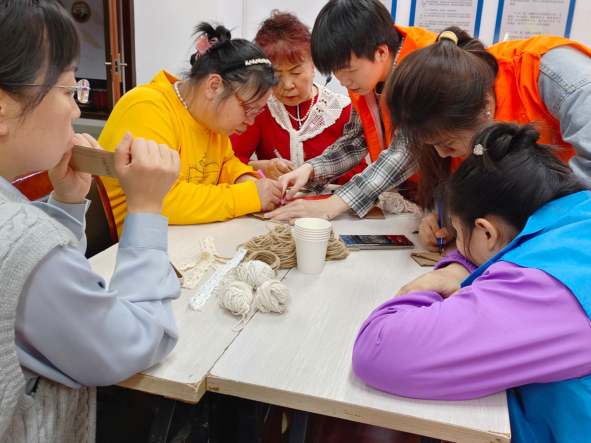 在活动中,志愿者们帮助活动参与者用一块废弃的纸板制作简单实用的手机支架,一块块纸板在他们的手中经过简单的描绘,裁剪,变成了实用的手机支架;一根细细的麻绳在她们手中飞舞,编制出漂亮的隔热袋,成功的喜悦在他们脸上浮现,现场的居民及其家属都兴致满满。在制作过程中,大家互相交流、互相帮助,不仅增进了彼此的了解与信任,也让居民邻里间感受到社区大家庭的温暖与和谐。