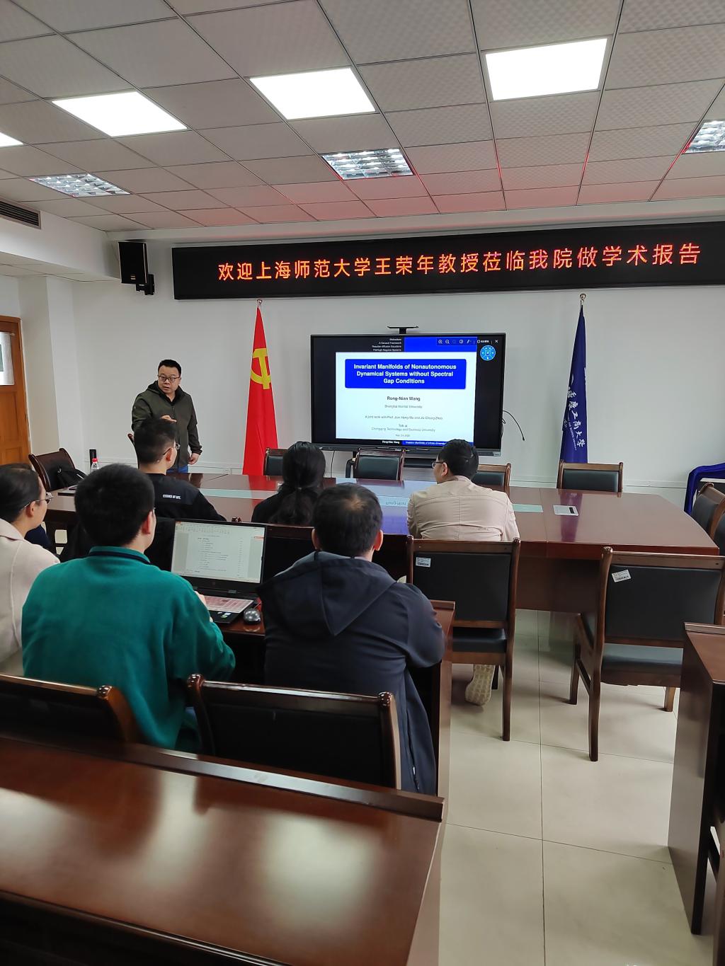 王荣年教授首先介绍了不变流形理论的基础知识,指出不变流形是微分方程与动力系统领域的重要研究对象。 然后介绍了无穷维非自治动力系统中的不变流形问题的最新研究进展和应用,特别是探讨了无谱间隙条件下如何建立无穷维非自治动力系统中的不变流形的一般性理论。最后,王教授介绍了非自治无穷维动力系统不变流形理论研究中产生的一些困难而有趣的公开问题,希望可以引发参会的青年教师的思考,并激励青年教师不断创新、勇攀科技高峰。报告结束后,参会教师与王教授进行了深入交流;与会老师表示,王教授的报告让他们受益匪浅。