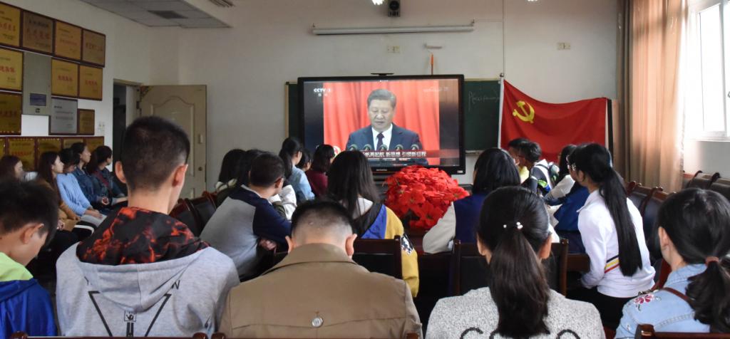 党的十九大,选举产生了新一届中央委员会和中央纪律检查委员会,并将习近平新时代中国特色社会主义思想写入党章。党的“十九大”是我国在全面建成小康社会决胜阶段召开的一次十分重要的代表大会,大会报告总结了我国过去五年的工作和历史变革,提出了新时代中国共产党的历史使命及新时代的中国特色社会主义思想等重要内容。报告指出,在新目标、新思想的指引下,中国青年当不断努力奋进,因为青年的面貌决定了中国特色社会主义的面貌。其中有关中国青年作用的论述让现场的同学们备受鼓舞。