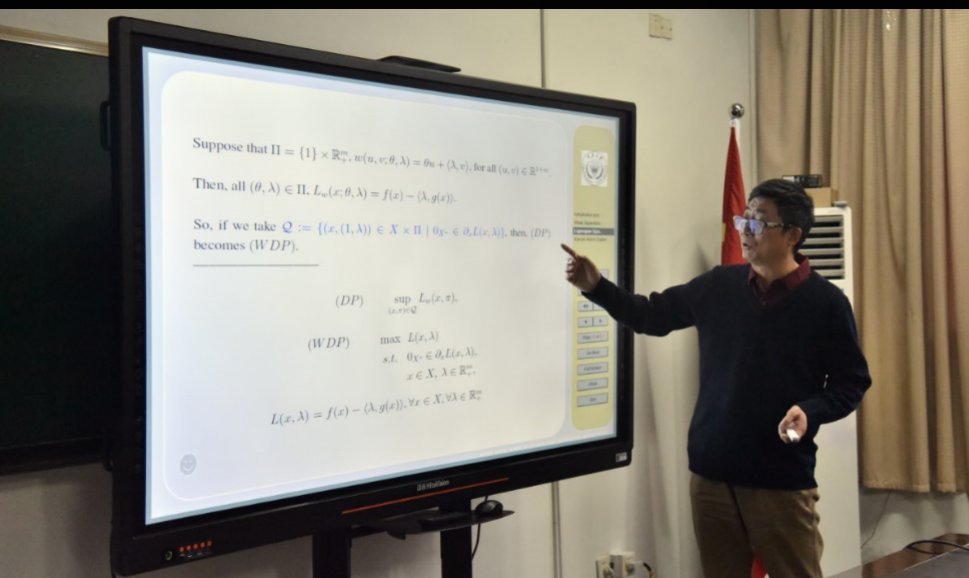 李声杰教授是重庆市第二届学术技术带头人,目前主要从事向量优化问题的理论以及应用研究。此次报告会李教授主要从约束品性、像空间分析、统一方案、正则性条件这四方面出发,向大家介绍了目前像空间分析方法及其作用。首先,李教授简述几种约束品性并指出引入必要的约束品性可得到“Karush/Kuhn-Tucker”最优化条件。紧接着李教授深入讲解了像空间分析的基本定义并结合典例逐步证明。最后大家就弱分离函数的构造、目标函数的选取以及像空间分析今后的研究方向进行热烈的讨论,李教授针对在座教师提出的问题做出详细解答。