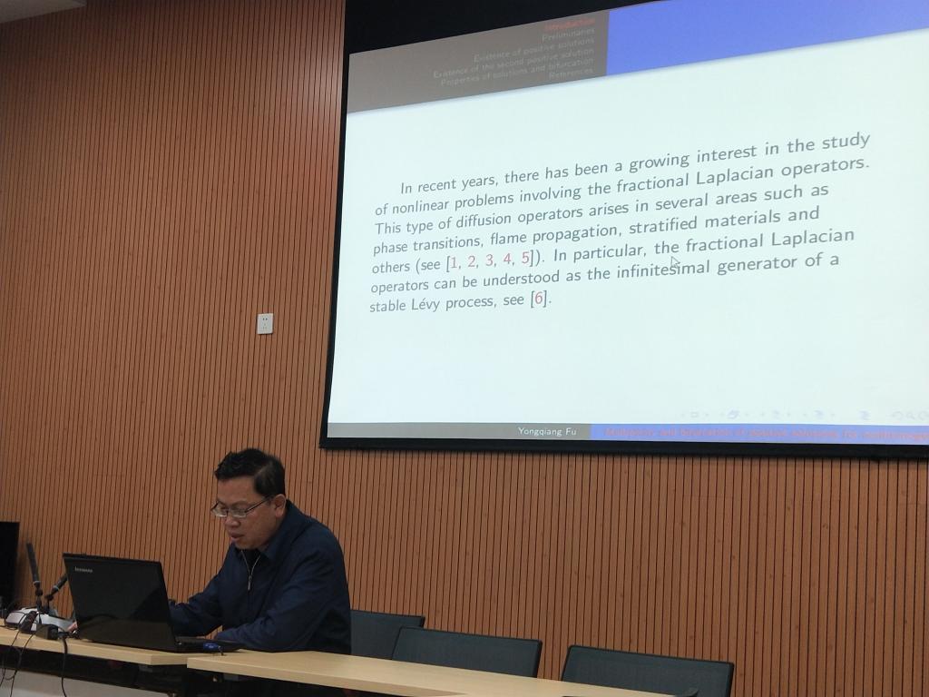 2019年11月30日下午3:10,哈尔滨工业大学付永强教授应我院蔺友江教授邀请,在新图书馆会议中心二会议室分别做了题为《Multiplicity and bifurcation of positive solutionsfor nonhomogeneous semilinear fractional Laplacian》的学术报告,学院相关学科老师及学生参加了本次报告会。