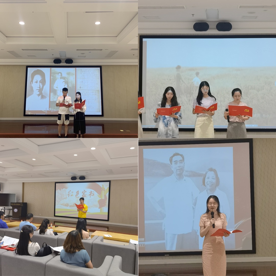 百年征程波澜壮阔,百年初心历久弥坚。在革命战争年代,无数仁人志士把对亲人的思念化为一封封充满亲情、爱情和革命理想的家书。品读革命烈士的家书,是对初心的再一次重温、再一次叩问,也是一个时代、一段历史的亲历、见证与体悟。伴随着优美的音乐,活动由党支部刘亚莉老师、专职组织员陈南飞老师、吴卫老师、毕业生党员胡敏同学朗诵的《赵一曼写给七岁儿子的家信》拉开序幕。同学们依次诵读着经典家书,其中既有王孝锡、陈觉、黄继光等革命先烈们悲壮的诀别家信,也有毛泽东、周恩来等伟人鲜为人知的真情流露,更有时代先锋袁隆平在崇高理想中表达对母亲的无限哀思......通过同学们声情并茂的诵读,让我们在追寻那段纵然纸短情长,却始终初心不忘的红色足迹中,感受家国情怀,讲述人间大爱,铭记党员初心,牢记时代使命,在场同学无不动容。