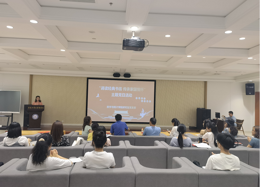 在中国共产党建党100周年之际,为深入贯彻学习习近平总书记在党史学习教育活动大会上的讲话精神,学史明理、学史增信、学史崇德、学史力行,进一步激发青年学生爱党爱国的热情,讴歌中国共产党带领人民实现中华民族伟大复兴中国梦的奋斗历程,数学与统计学院研究生党支部于2021年6月24日在图书馆视听阅览室开展了“诵读经典书信,传承家国情怀”为主题的党日活动。数学与统计学院党委唐玺书记、叶勇副院长、专职组织员陈南飞老师、研究生党支部全体党员和部分入党积极分子参加此次活动。