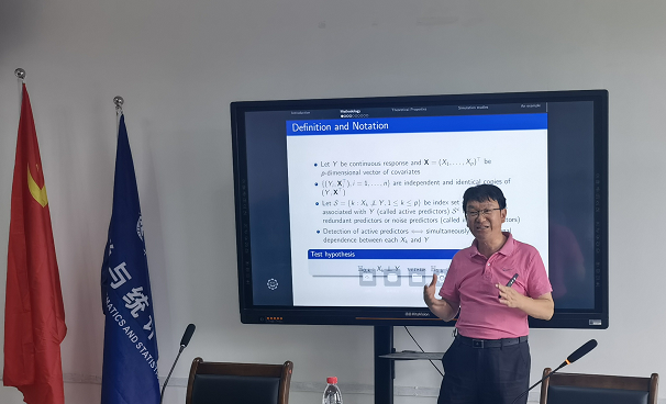 近日,云南大学数学与统计学院院长唐年胜教授应邀来我校进行学术交流。7月16日上午,唐年胜教授为数学与统计学院师生做了题为《Quantile correlation-based variable selection》的学术报告。学术报告由数学与统计学院党委书记唐玺主持,学院统计学科的胡雪梅教授、胡桂华教授、赵培信教授、杨宜平教授等骨干教师、重庆理工大学的邱世芳教授和部分研究生参加了此次学术报告会。