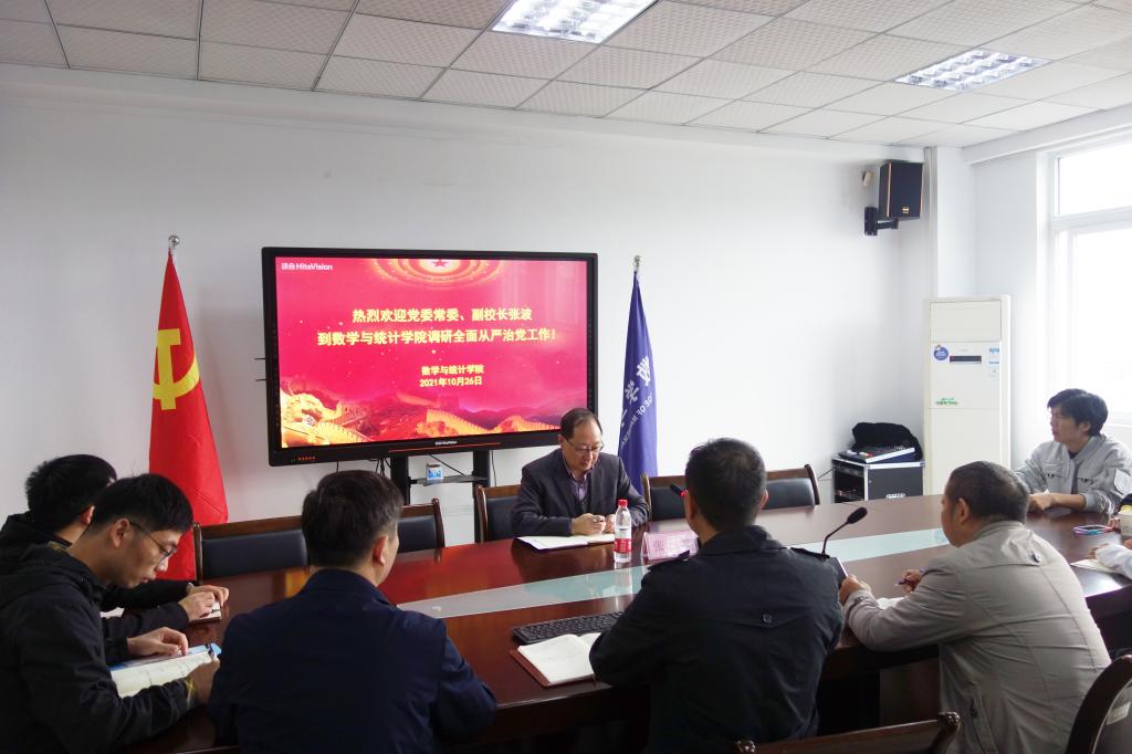 2021年10月26日,根据学校关于全面从严治党工作部署,党委常委、副校长张波到数学与统计学院调研全面从严治党工作,对数学与统计学院全面从严治党工作开展情况进行调研和督查,数学与统计学院全体党委班子成员、科室主任、支部书记、支委委员在学院会议室参加调研会。