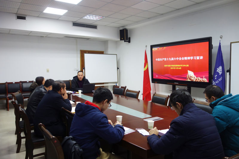 唐玺讲到,党的十九届六中全会是在党成立一百周年的重要历史时刻,在党和人民顺利实现第一个百年奋斗目标、全面建成小康社会,向着全面建成社会主义现代化强国的第二个百年奋斗目标迈进的重大历史关头,召开的一次十分重要的会议。全会通过的《中共中央关于党的百年奋斗重大成就和历史经验的决议》是坚持辩证唯物主义和历史唯物主义的方法论,坚持正确党史观、树立大历史观,体现了党中央对党的百年奋斗的新认识,体现了党中央对党的百年奋斗的新认识,是一篇光辉的马克思主义纲领性文献,是新时代中国共产党人牢记初心使命、坚持和发展中国特色社会主义的政治宣言,是以史为鉴、开创未来、实现中华民族伟大复兴的行动指南。他还谈到,一百年来,党领导人民进行伟大奋斗,积累了宝贵的历史经验,凝结着鲜血和汗水,充满着智慧和勇毅,是我们党弥足珍贵的精神财富。我们要把这些宝贵经验运用到学院的工作实践中,使各项工作更好体现时代性、把握规律性、富有创造性。最后他强调,深入学习宣传和贯彻落实党的十九届六中全会精神是当前和今后一段时期的重要政治任务,学院各级党组织要制定好六中全会精神学习计划方案,利用政治理论学习、“三会一课”、主题党日活动等方式开展专题学习,通过理论学习、辅导报告、集体研讨、撰写心得体会等形式,组织全院党员和师生深入学习全会精神。要通过学院网站、微信公众号、企业微信群、办公区宣传栏等载体,对全会精神开展集中宣传,积极营造浓厚的学习氛围。要把学习宣传贯彻党的十九届六中全会精神与党史学习教育、“七一”重要讲话学习宣讲融合起来,更好地团结凝聚学院党员干部、师生员工,齐心协力、共谋发展,将学习的成果转化为推动学院改革发展的长足动力。