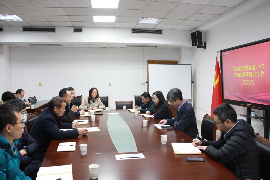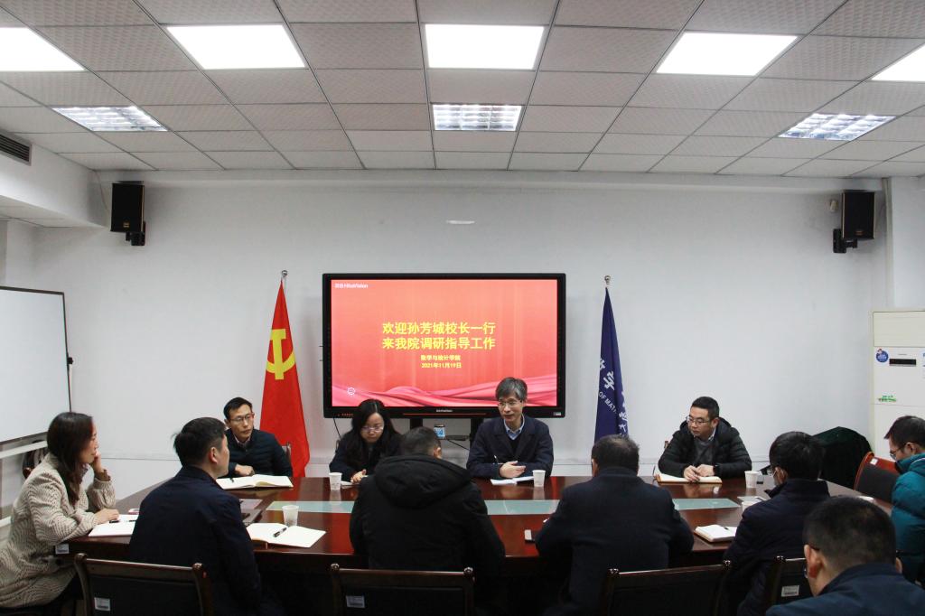 近日,党委常委、校长孙芳城到数学与统计学院调研指导工作,人事处、教务处、科研处相关负责人陪同调研。学院全体领导班子成员、专职组织员、支部书记、系部主任和部分行政管理人员参加了调研会。