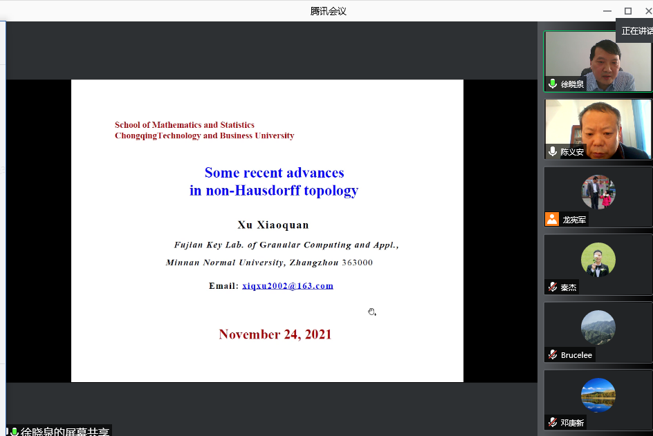 2021年11月24日,闽南师范大学徐晓泉教授为我院教师做了题为《Non-Hausdorff拓扑最新进展》的精彩报告,报告由数学与统计学院院长陈义安教授主持,部分教师和研究生参加了本次报告会。